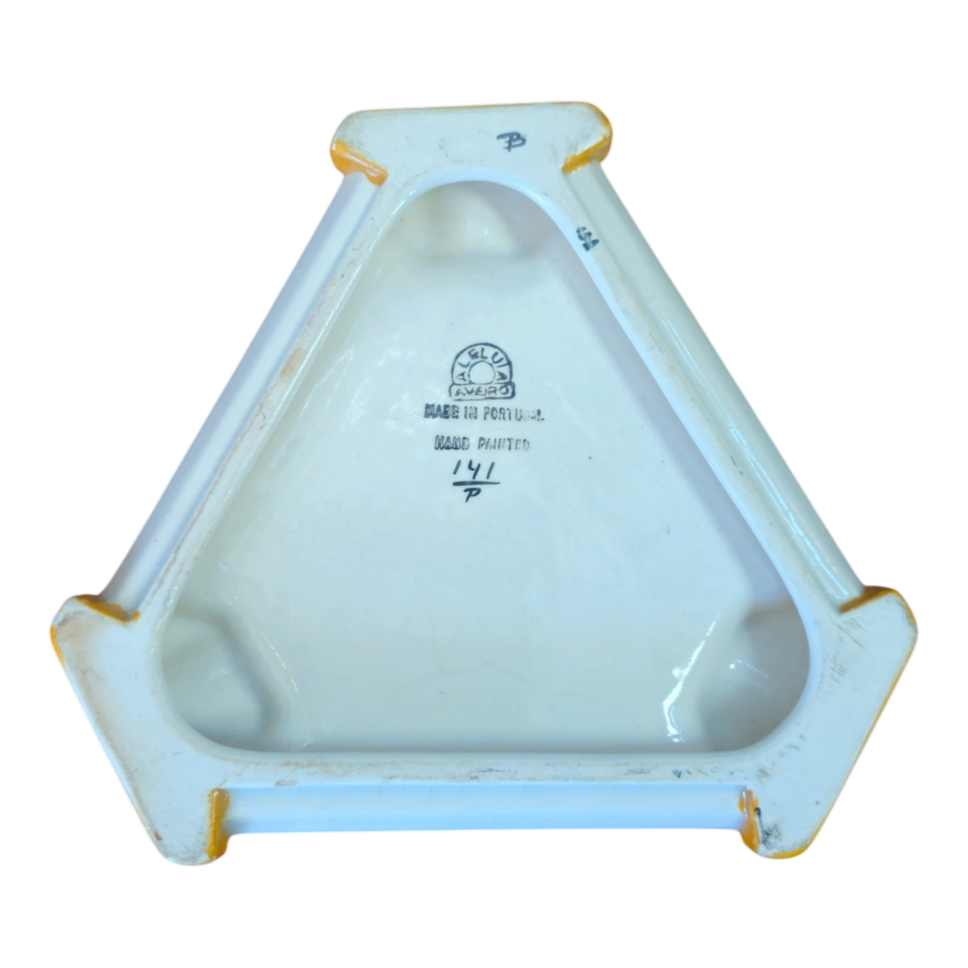 A peça apresenta três apoios para cigarro e bordas decoradas em tons de verde e preto, com pequenos pés na base. Este tipo de cinzeiro era muito comum entre as décadas de 1950 e 1970, sendo hoje procurado como objeto de coleção ou decoração vintage.
