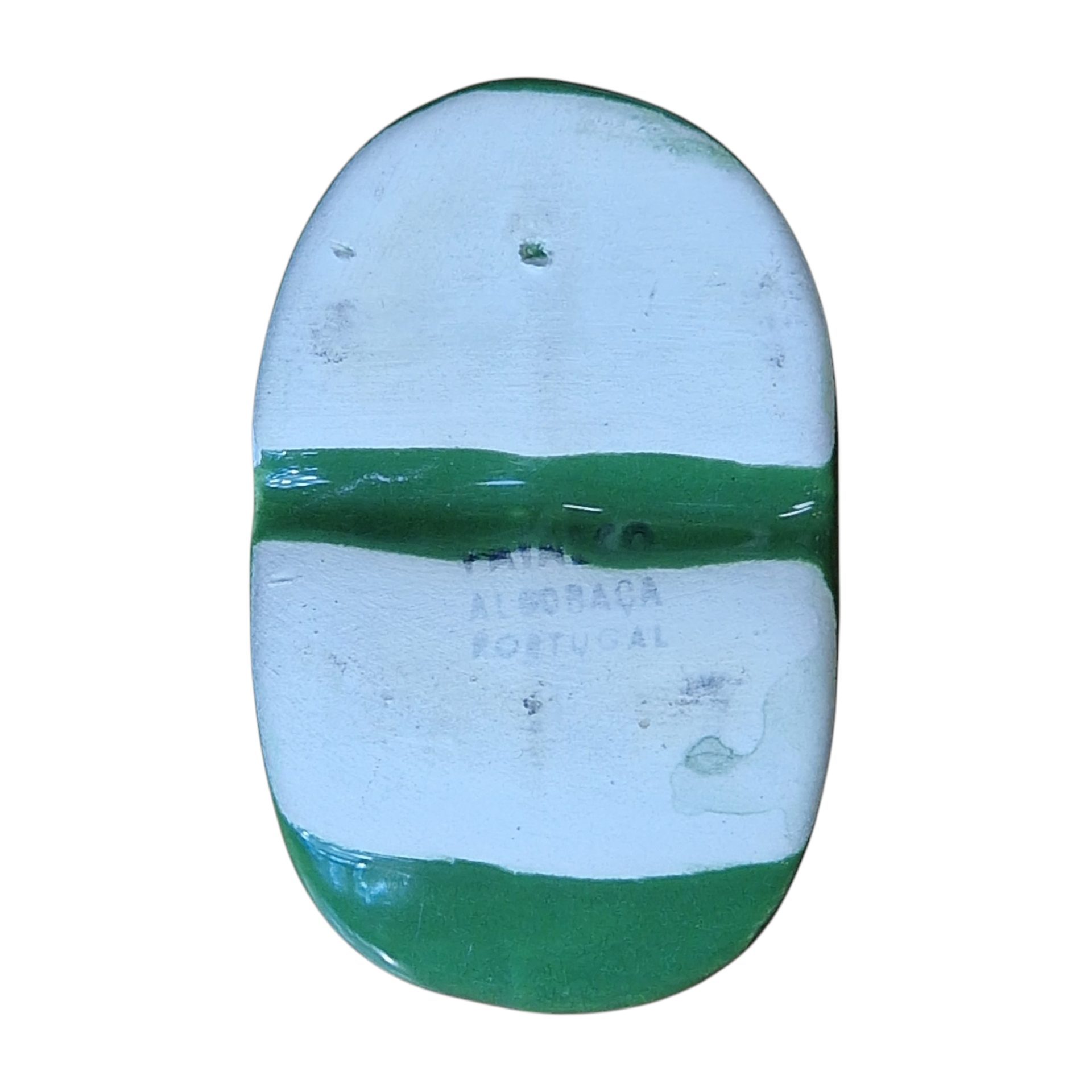Pequena figura decorativa em forma de bota, com esmalte verde brilhante e ligeiro craquelê visível. Produção cerâmica da região de Alcobaça, conhecida pela sua tradição em faiança decorativa.