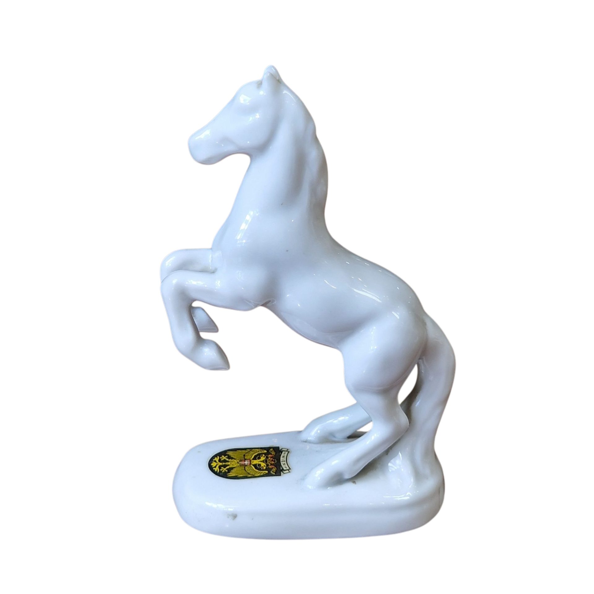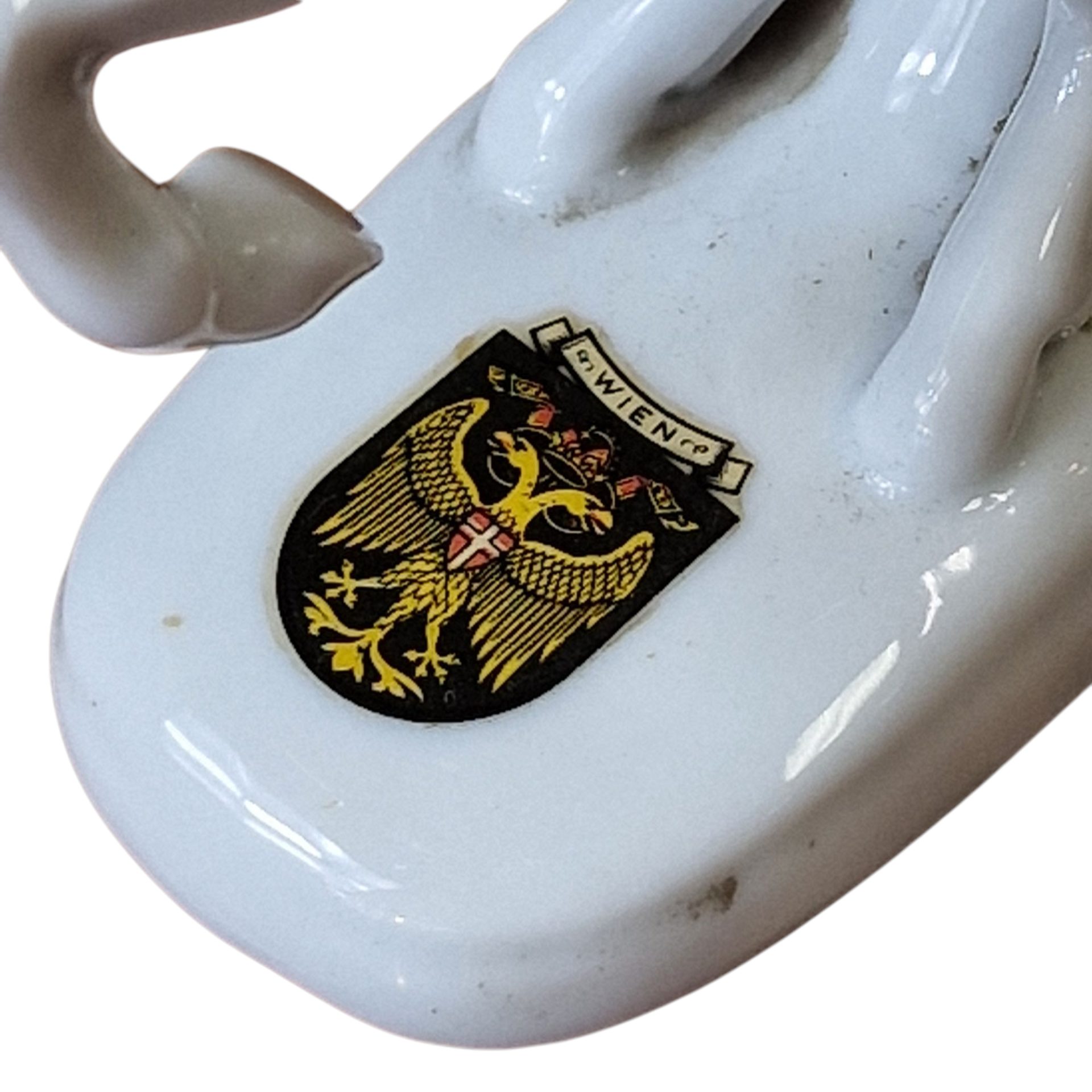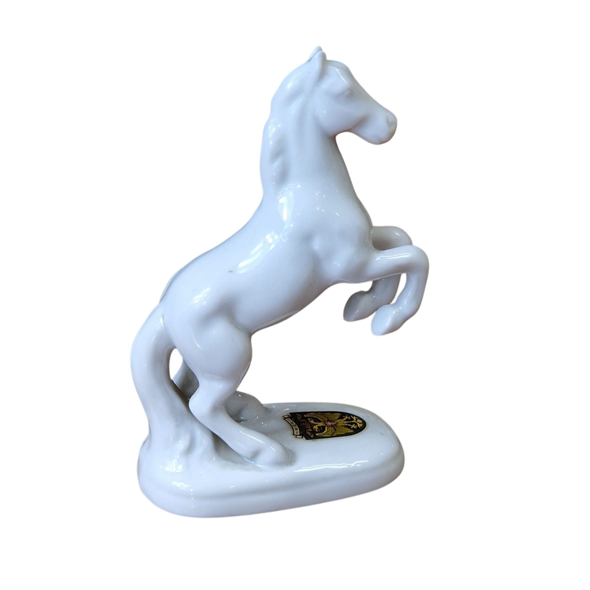 Este elegante conjunto apresenta dois cavalinhos em porcelana branca, representados em pose empinada com as patas dianteiras levantadas, evocando movimento e imponência. Ambos estão fixos sobre uma base oval onde figura um brasão dourado e preto, típico da região de origem. A porcelana é vidrada, com acabamento brilhante, e evidencia detalhes refinados nas formas anatómicas dos cavalos. Produzidos pela marca Wien, na Alemanha, estas figuras decorativas refletem a tradição cerâmica germânica, especialmente associada a peças comemorativas ou de coleção turística. São ideais para embelezar estantes, vitrinas ou espaços equestres.