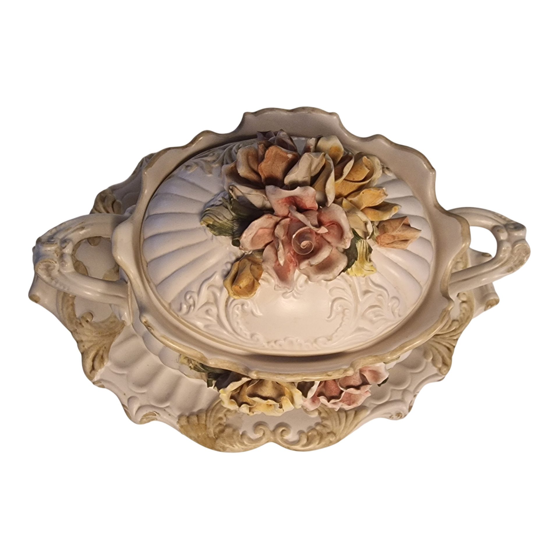 A riqueza do relevo, o colorido floral e o realismo escultórico fazem desta terrina uma autêntica obra de arte decorativa Capodimonte, símbolo de requinte e tradição.