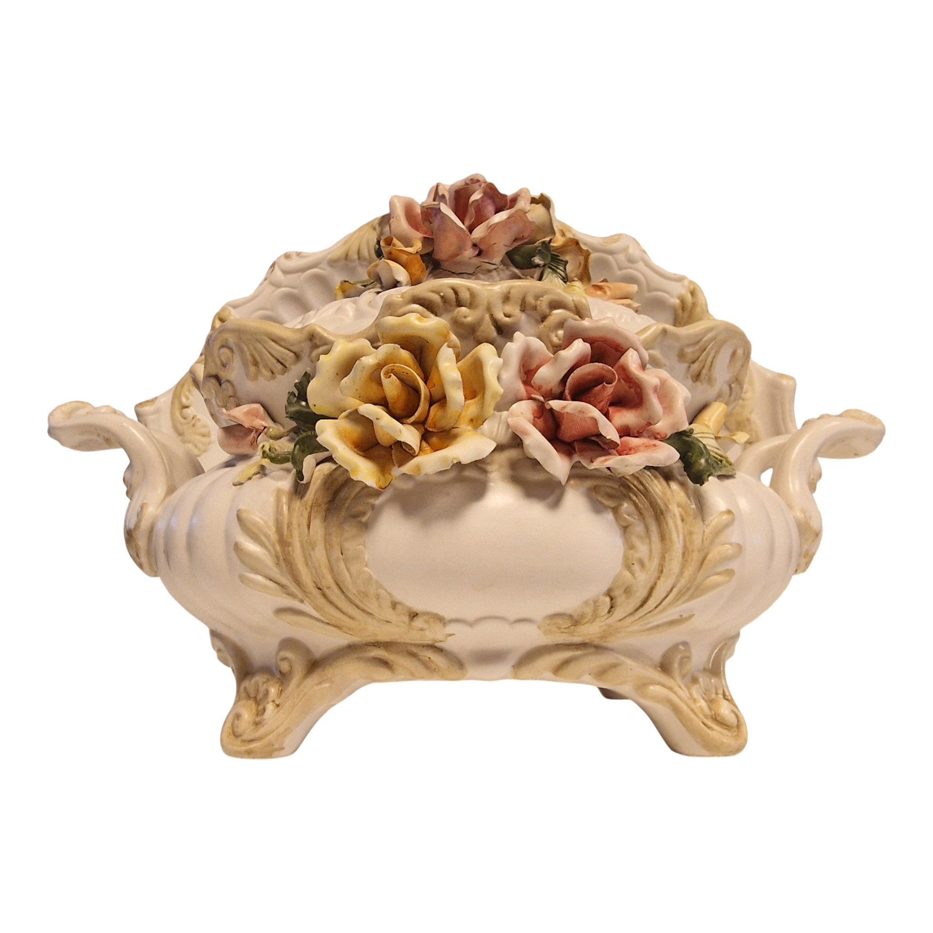 Este exemplar destaca-se pela sua elaboração escultórica e ornamentação floral, representando a excelência da tradição Capodimonte, famosa pela delicadeza das flores e pela riqueza dos relevos decorativos.