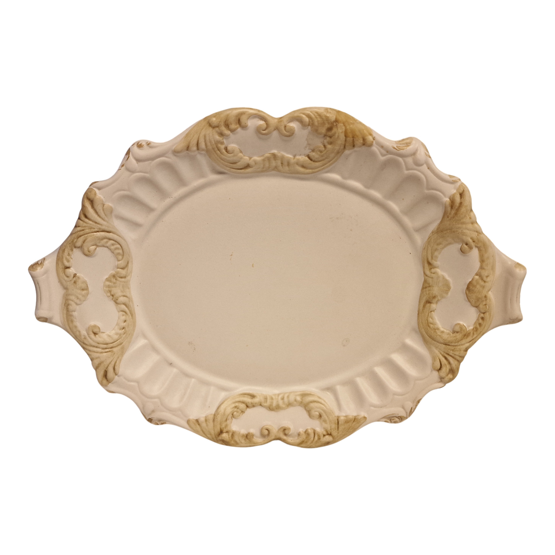 O corpo exibe formas curvas e volumetria barroca, com alças duplas modeladas, concheados e arabescos dourados em tom sépia.