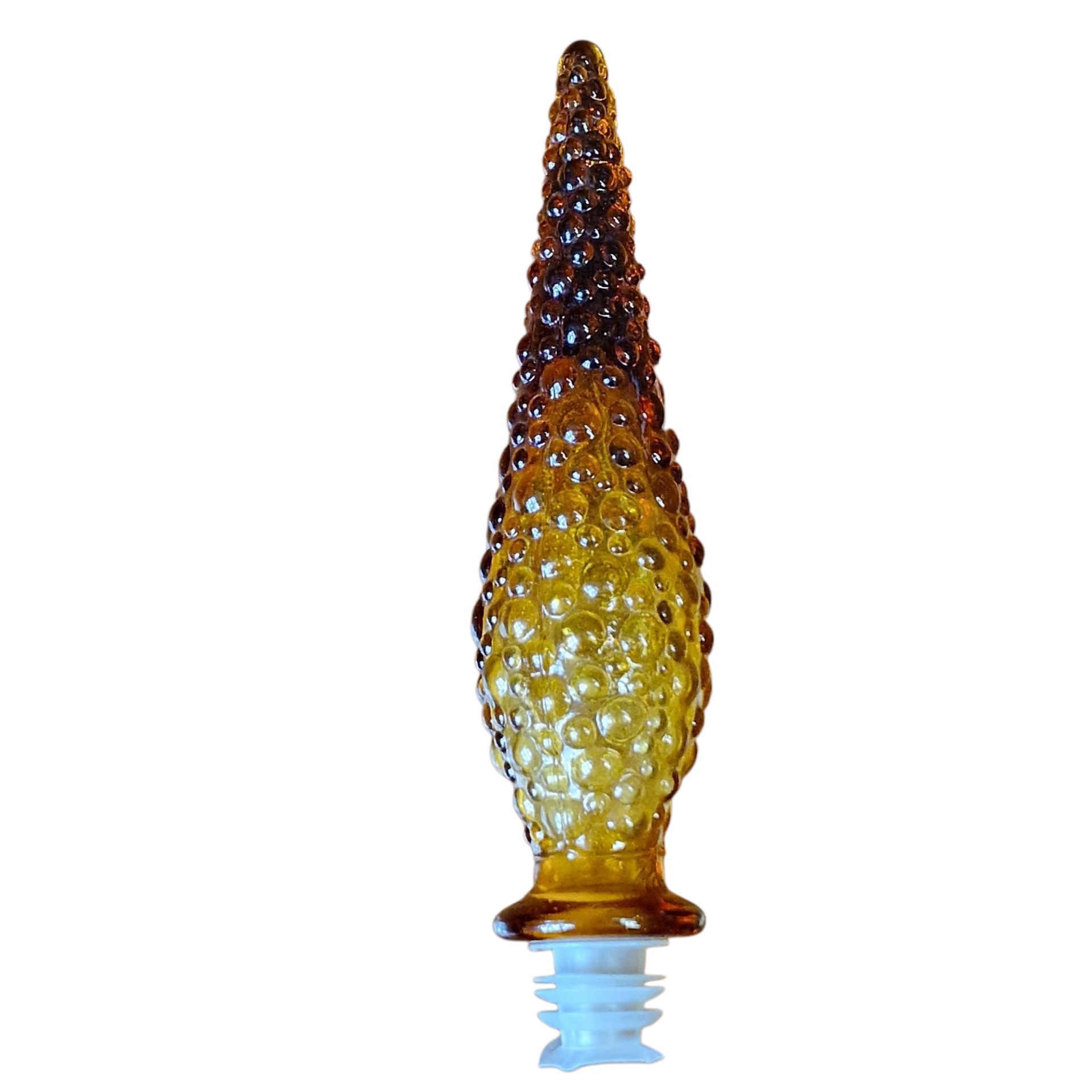 Esta elegante garrafa decorativa em vidro moldado é um exemplar de fabrico italiano, destacando-se pela sua tonalidade âmbar quente e superfície texturada com padrão de bolhas verticais. A tampa original em vidro segue a mesma estética, com forma de pinha alongada e encaixe em espiral de plástico, o que assegura a vedação e preservação. A peça apresenta um formato alongado e esguio, com base arredondada larga que vai afunilando em direção ao gargalo. O design exuberante e retro faz lembrar os estilos da década de 1960, sendo ideal para decoração de interiores ou colecionadores de vidro artístico.