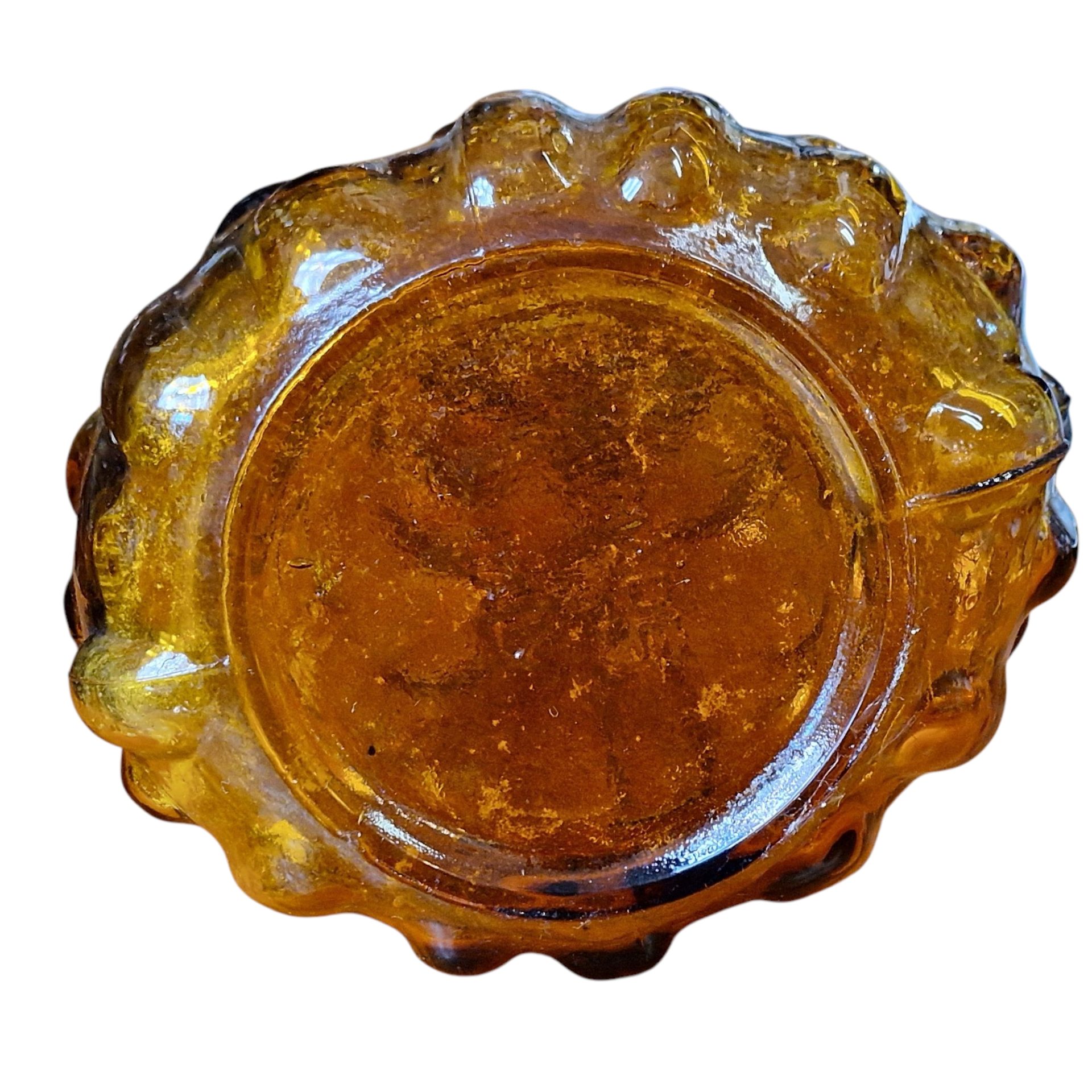 Sobre a peça: Uma peça marcante em vidro âmbar moldado, esta garrafa decorativa combina funcionalidade com estética vintage, sendo uma adição sofisticada a qualquer interior de inspiração retro ou coleção de vidro europeu.