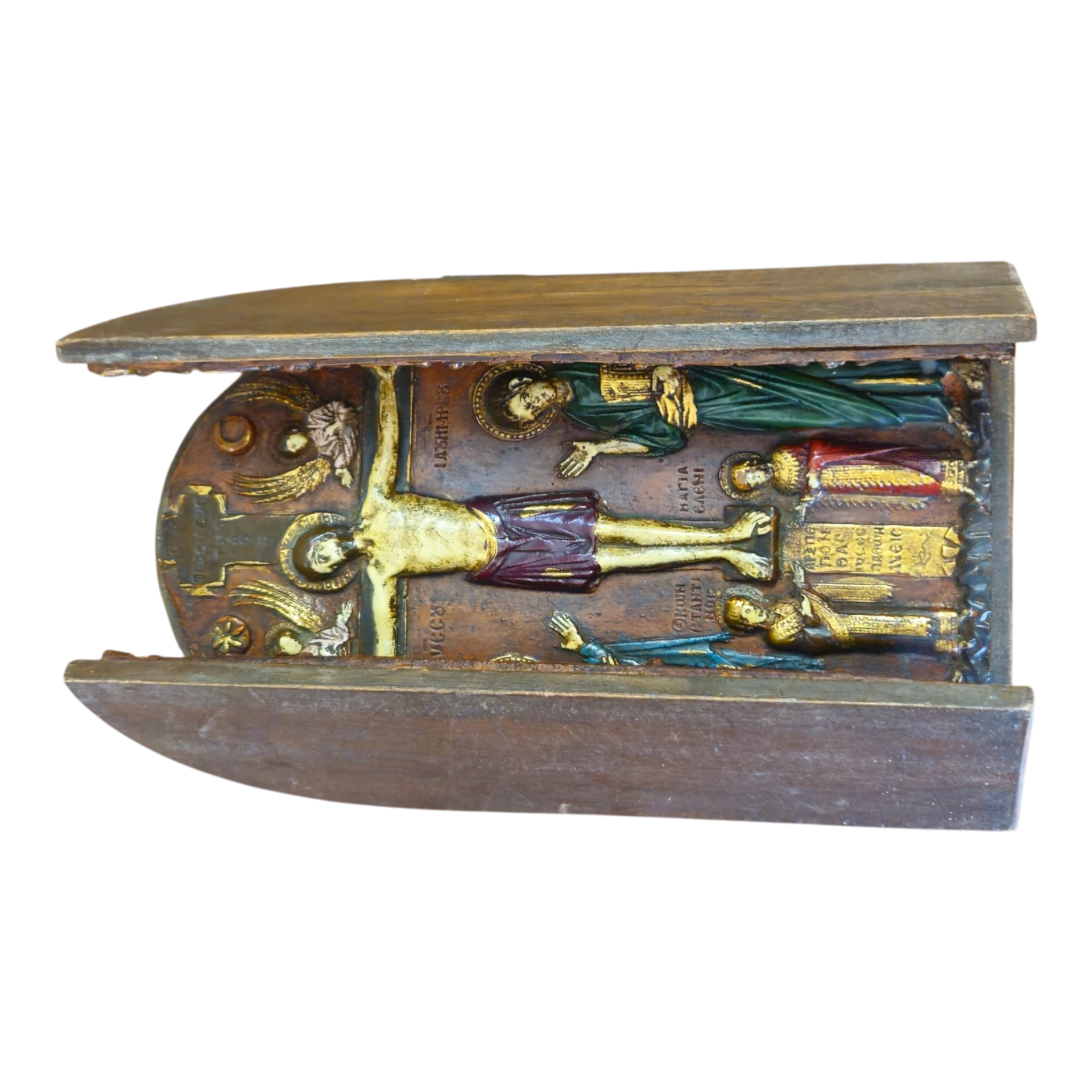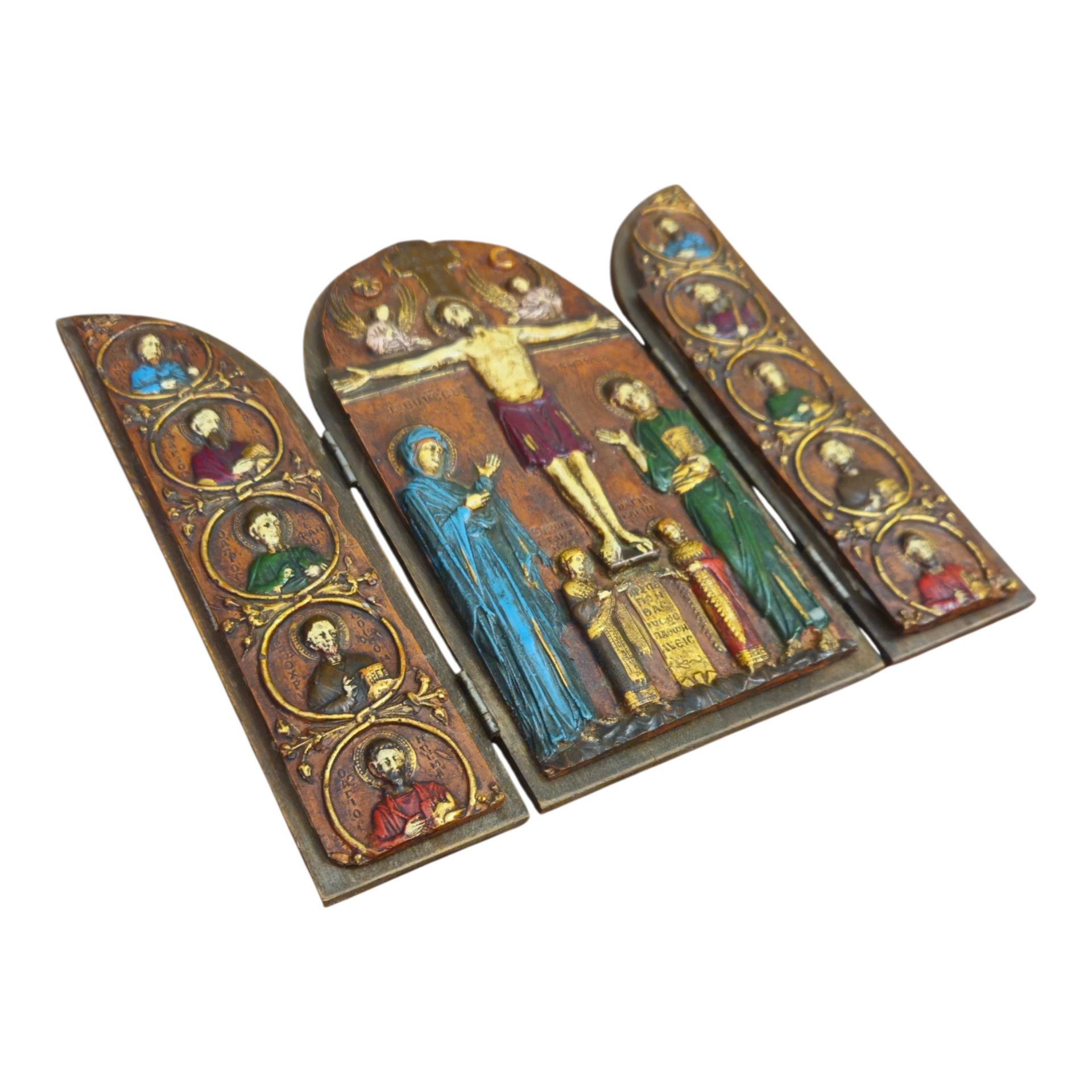 Ícone religioso tríptico representando a crucificação de Jesus com os 12 apóstolos em relevo policromado.