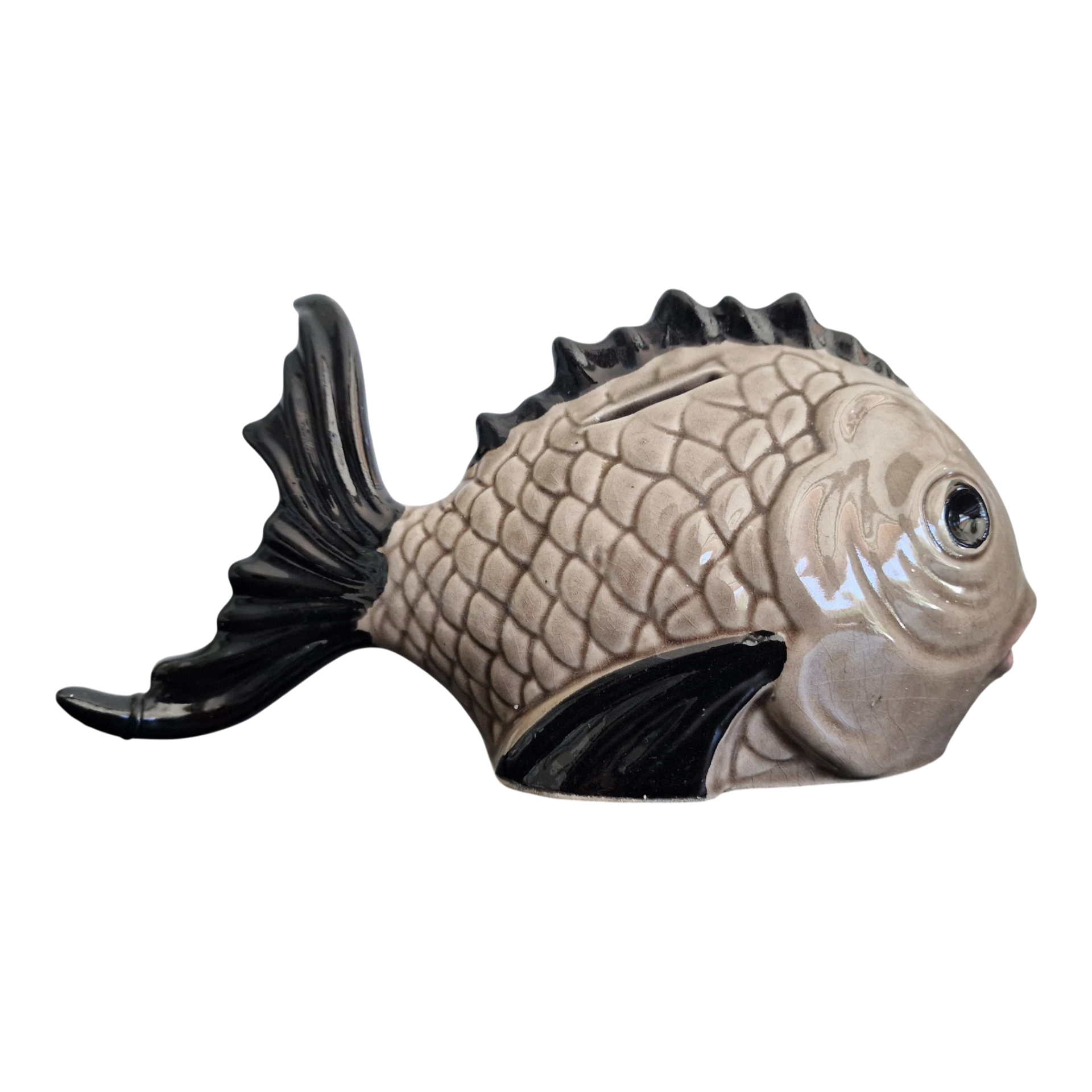 Elegante e invulgar mealheiro em faiança portuguesa, produzido nas Caldas da Rainha, representando um peixe de carácter expressivo e modelação cuidada.