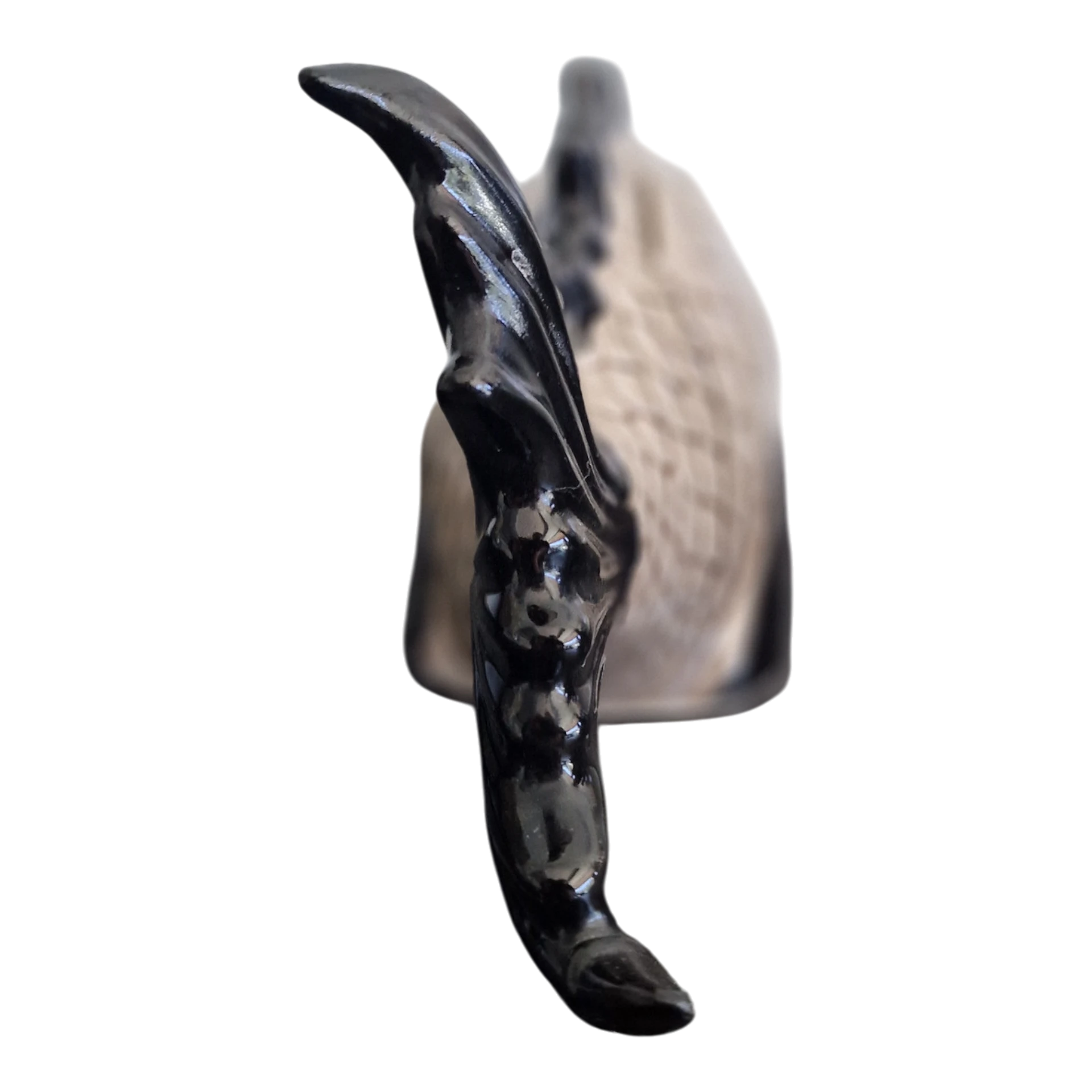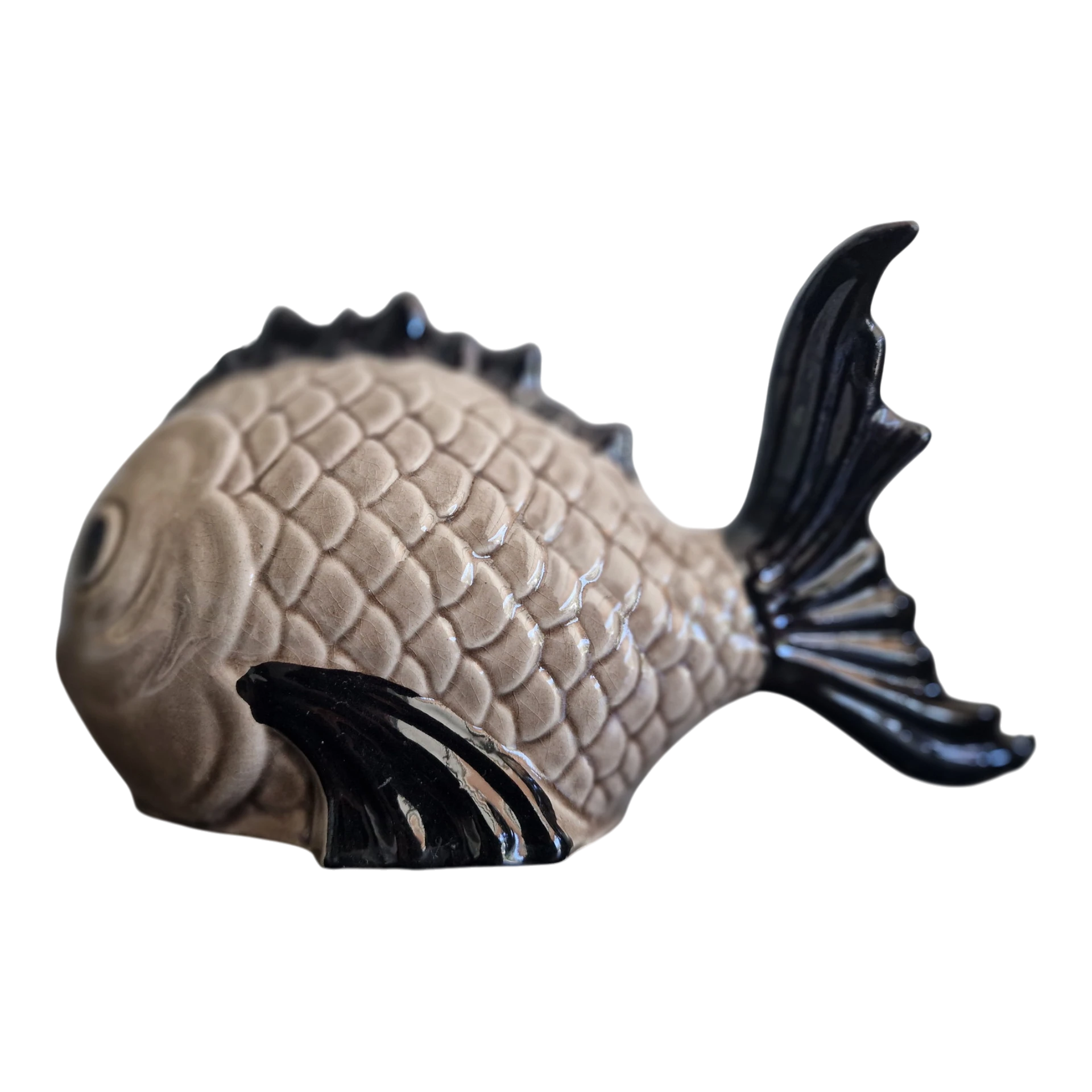 A peça evidencia um tratamento detalhado das escamas e das barbatanas, com vidrado em tons neutros contrastados por elementos em preto, conferindo-lhe profundidade e destaque decorativo. A expressividade do rosto e a estilização naturalista são características típicas da produção cerâmica desta região.