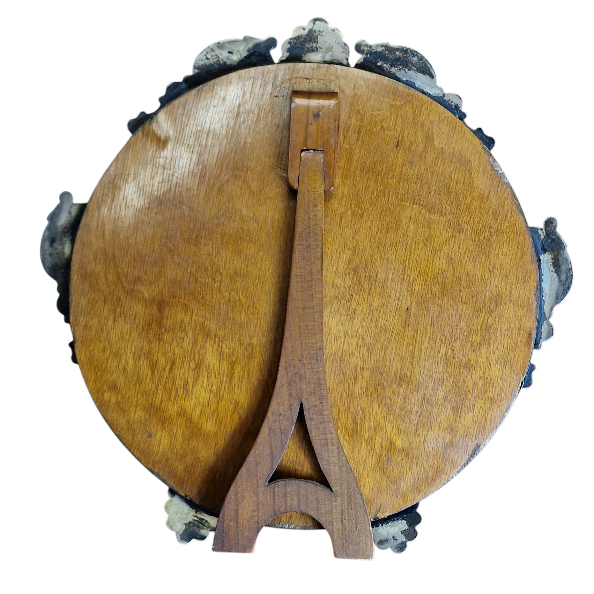 Elegante espelho de mesa em formato redondo com estrutura metálica prateada, ornamentada com cinco apliques em relevo que remetem a motivos florais e concheados, conferindo um estilo clássico ou neobarroco à peça. O espelho apresenta acabamento biselado, acrescentando sofisticação ao design. A estrutura apoia-se em três pés robustos, também ornamentados, que elevam ligeiramente o espelho da superfície. Ideal para toucadores, aparadores ou como peça decorativa. O suporte traseiro permite manter o espelho inclinado, sendo funcional e decorativo. Apresenta sinais ligeiros de uso compatíveis com a idade, mas encontra-se em bom estado geral.