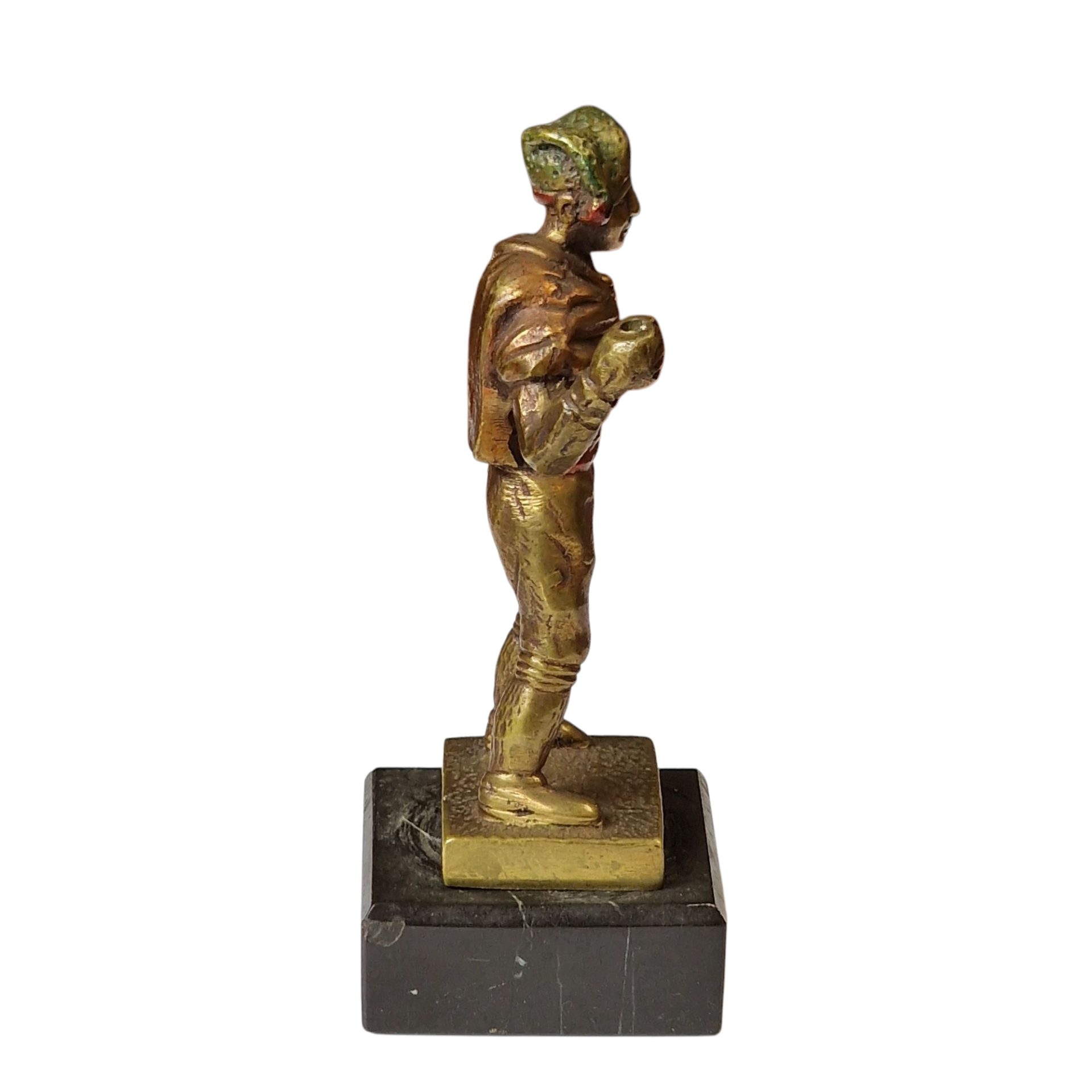Estatueta figurativa em metal fundido e pintado à mão, representando um forcado português com barrete verde e faixa vermelha, numa pose firme e tradicional da pega de touros. A peça apresenta traços detalhados nas vestes e fisionomia, sendo montada sobre uma base quadrada de mármore preto, que confere estabilidade e um aspeto nobre à composição. Falta um elemento na mão esquerda, originalmente parte da figura (possivelmente uma capa ou outro acessório). Escultura compacta e decorativa, com forte simbolismo cultural português.