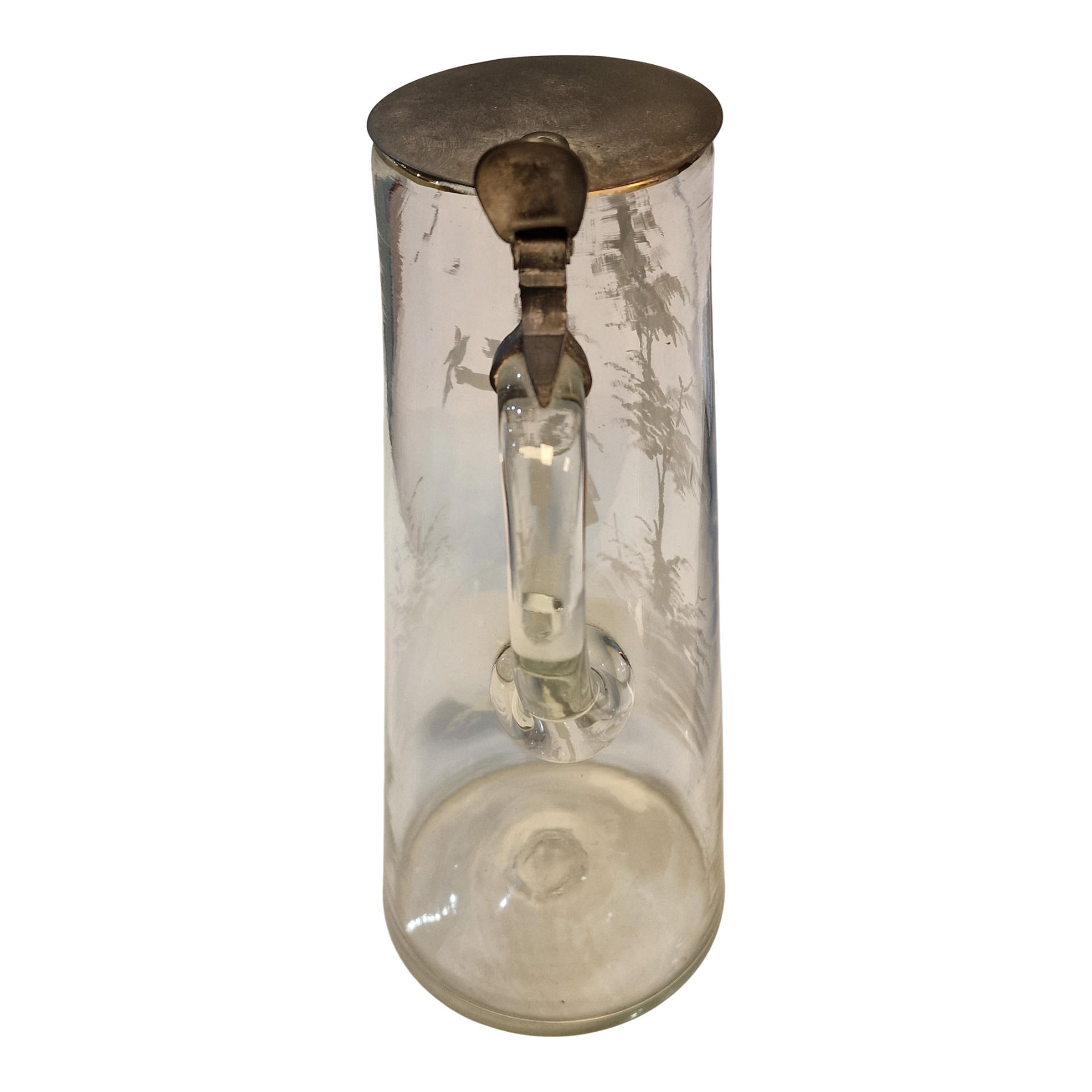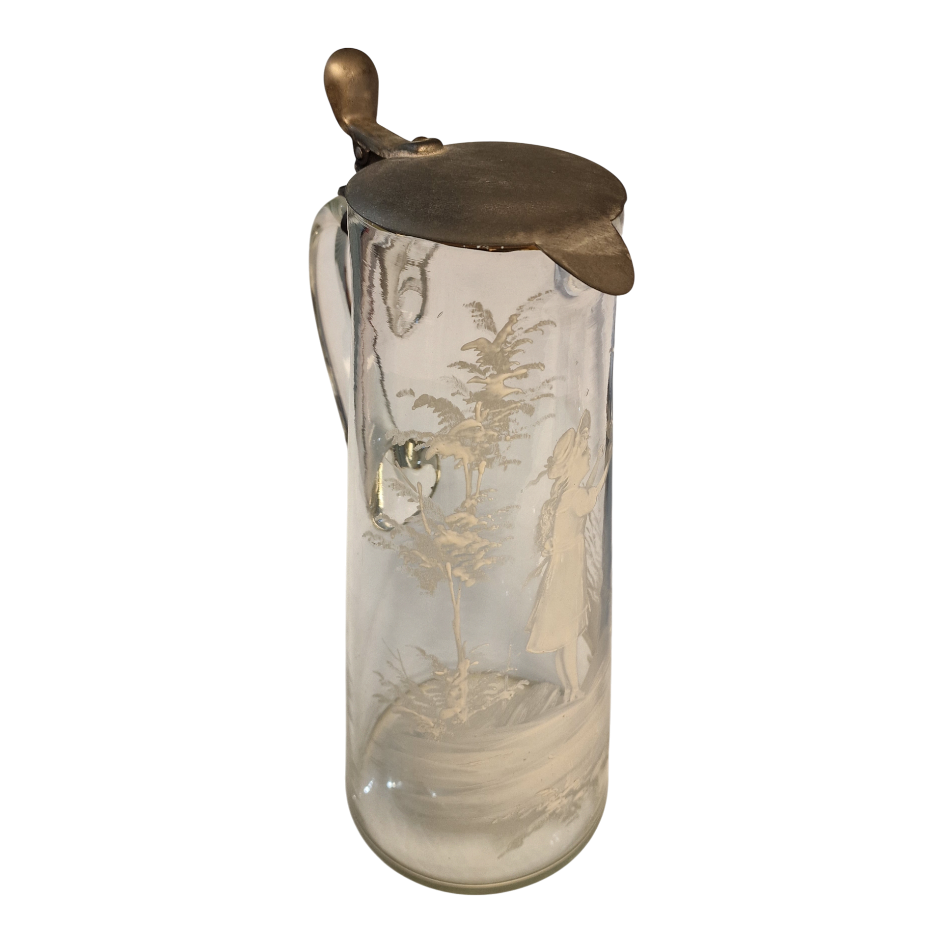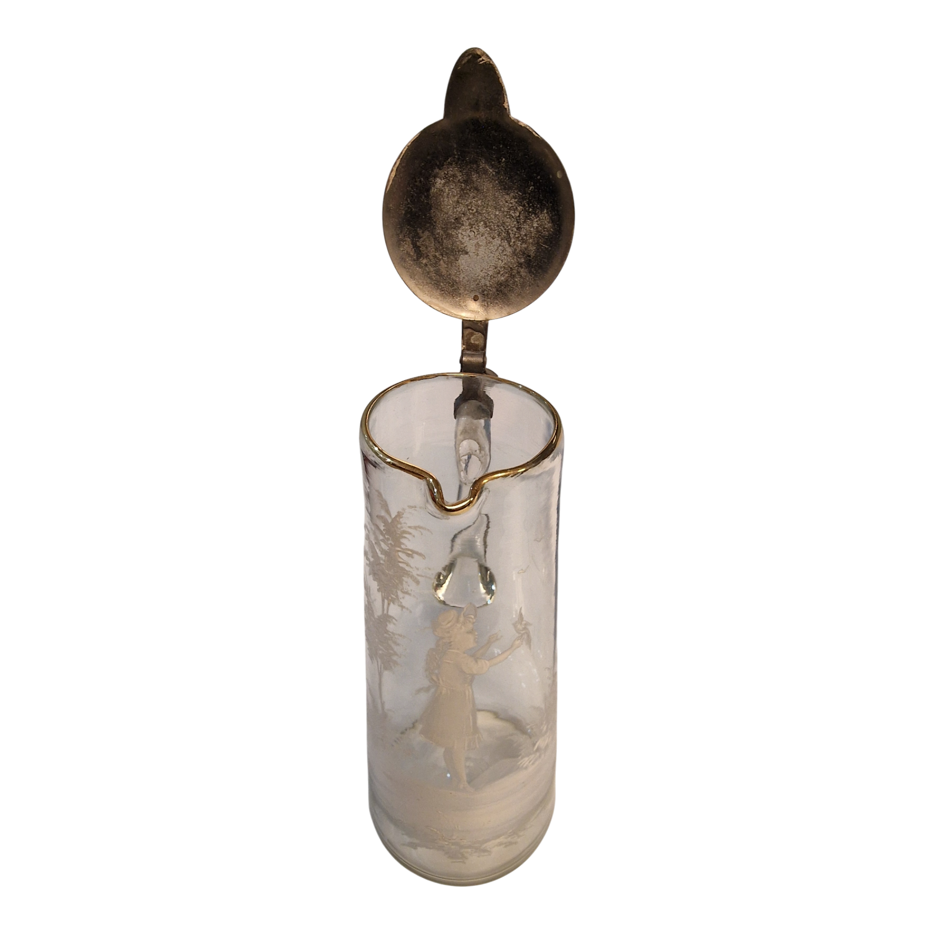 Jarra antiga em vidro transparente, pintada à mão a esmalte branco com cena campestre feminina. Possui tampa metálica articulada e mede aproximadamente 27,5 cm de altura por 12 cm de diâmetro na base. Peça elegante de época, rara e colecionável, em muito bom estado.