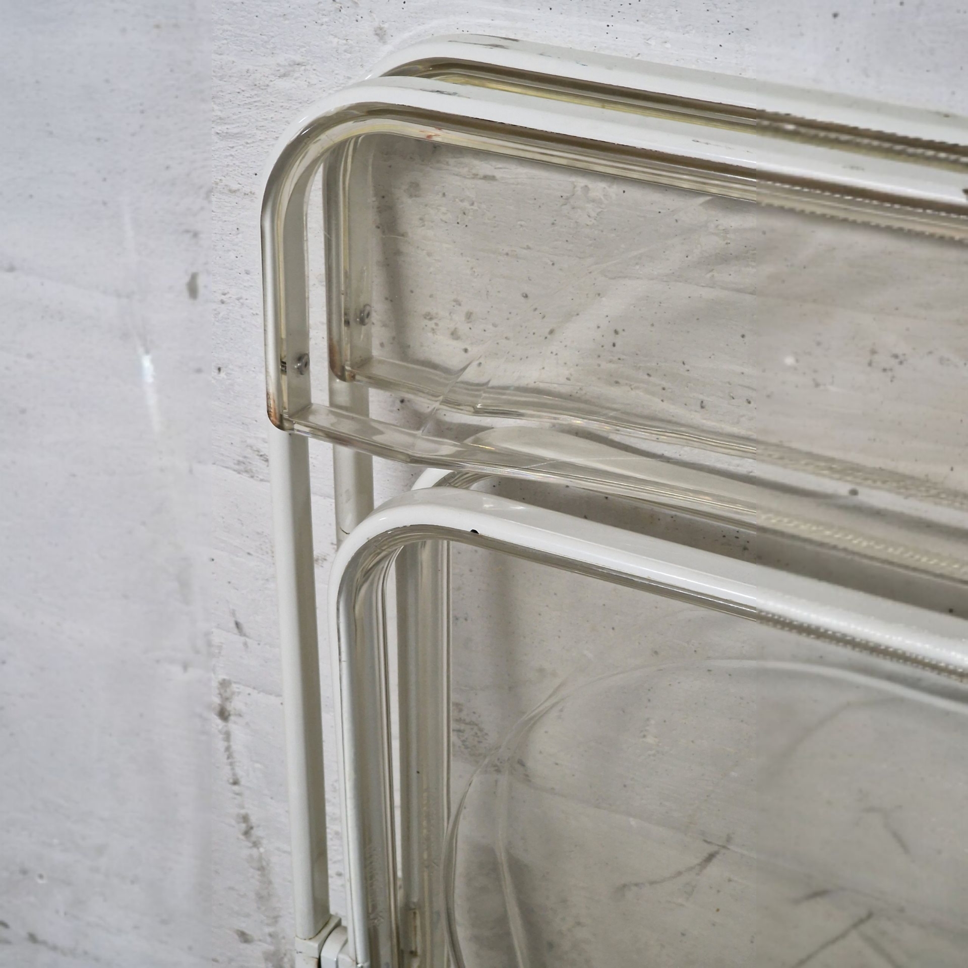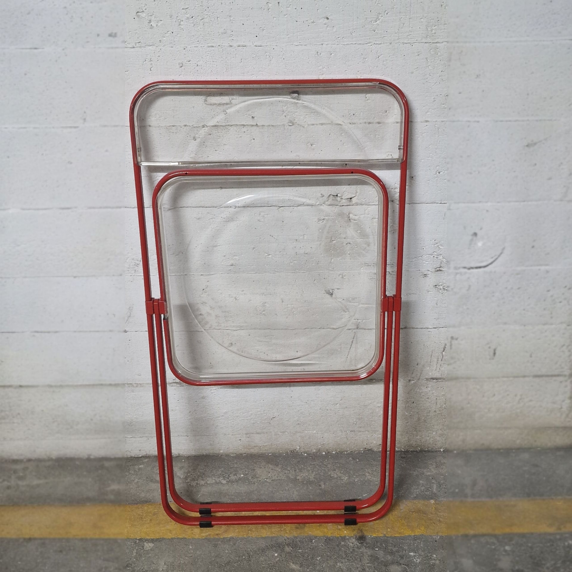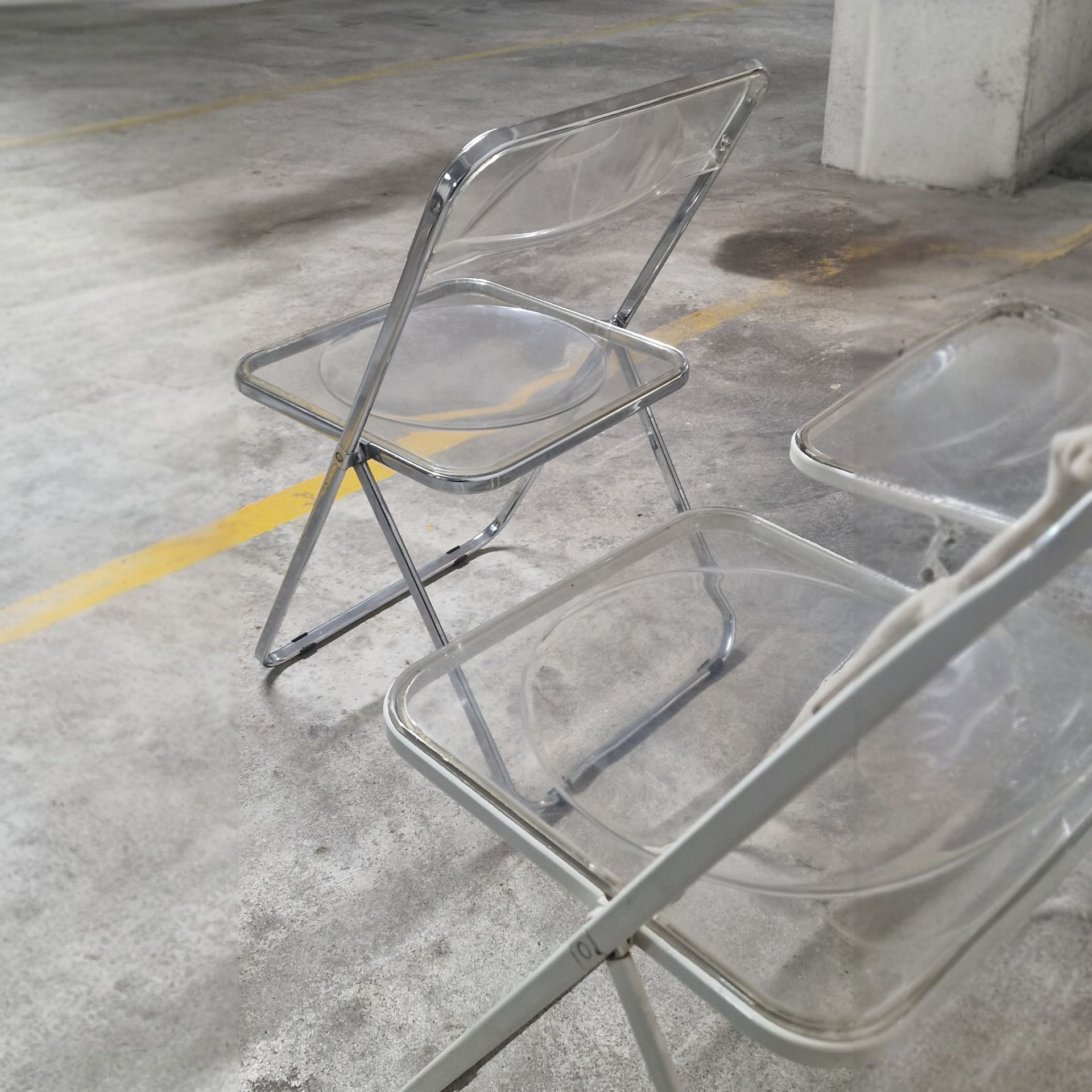 Conjunto de 5 cadeiras originais Stua (Patent), com estrutura metálica e assento/encosto em acrílico colorido. Inclui 2 brancas, 2 vermelhas e 1 prateada. Todas apresentam sinais de uso.