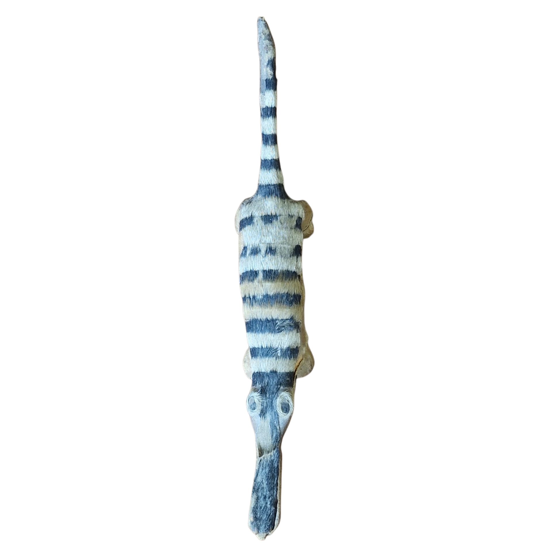 Peça escultórica em forma de animal semelhante a um crocodilo ou lagarto exótico, realizada em barro moldado à mão, revestido integralmente com couro pintado e pêlo natural ou sintético. Os detalhes, como os olhos, boca aberta e listras no corpo, foram cuidadosamente pintados a preto sobre o fundo amarelado do couro, criando um efeito visual de padrão animal. A peça apresenta características etnográficas ou artesanais, possivelmente de origem africana, latino-americana ou de arte popular. Apesar da sua natureza rústica, o trabalho evidencia técnica manual e propósito decorativo. Ideal para colecionadores de arte tribal, objetos curiosos ou decoração temática.