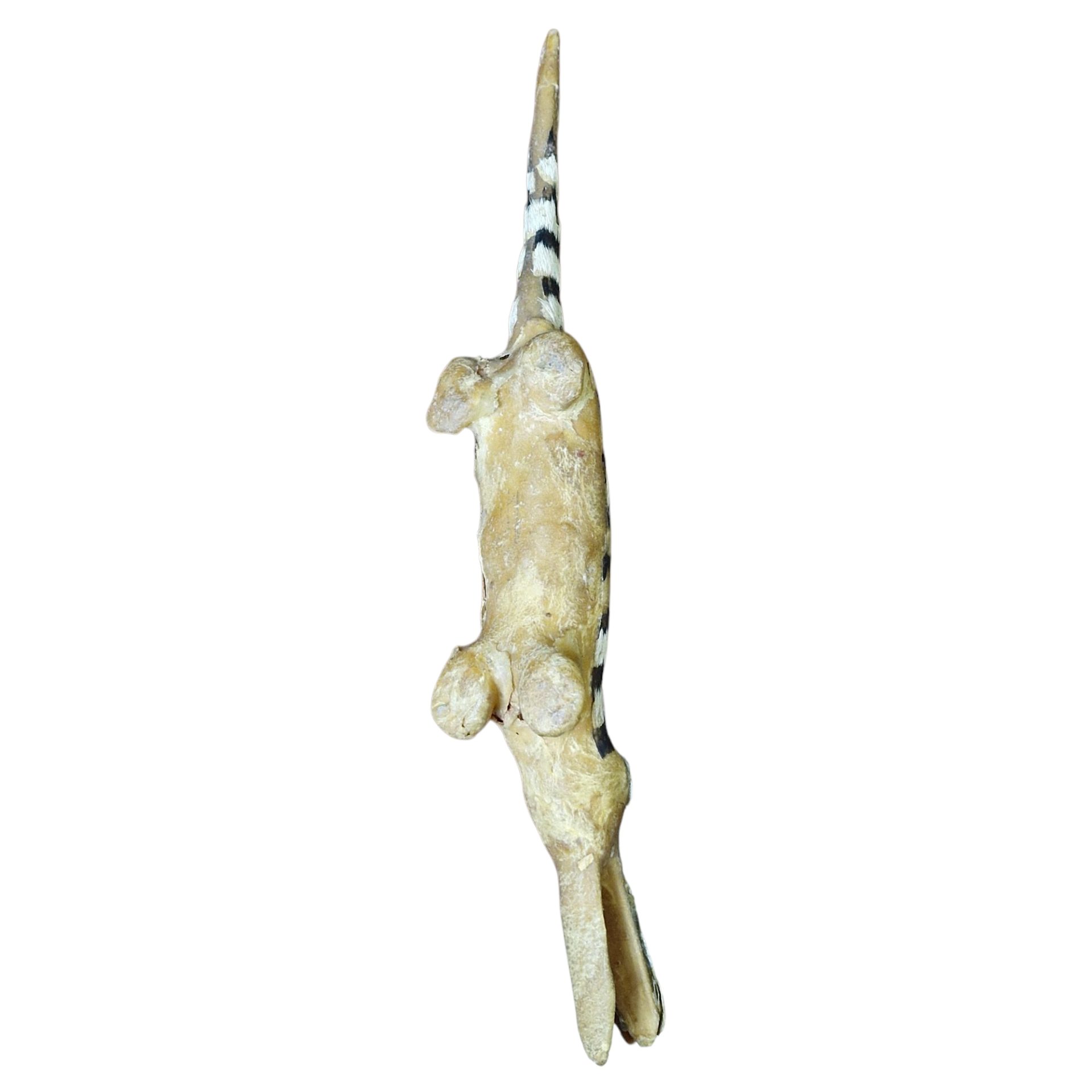 Sobre a peça: Escultura artesanal de animal em barro revestido com couro e pêlo, pintado com padrão listrado, com expressão peculiar e pormenores manuais. Peça de caráter decorativo ou colecionável, com um estilo primitivo ou tribal, frequentemente encontrada em mercados de arte étnica. Pode ser usada como elemento decorativo ou curiosidade artesanal, evocando o trabalho tradicional com materiais naturais e técnicas manuais.