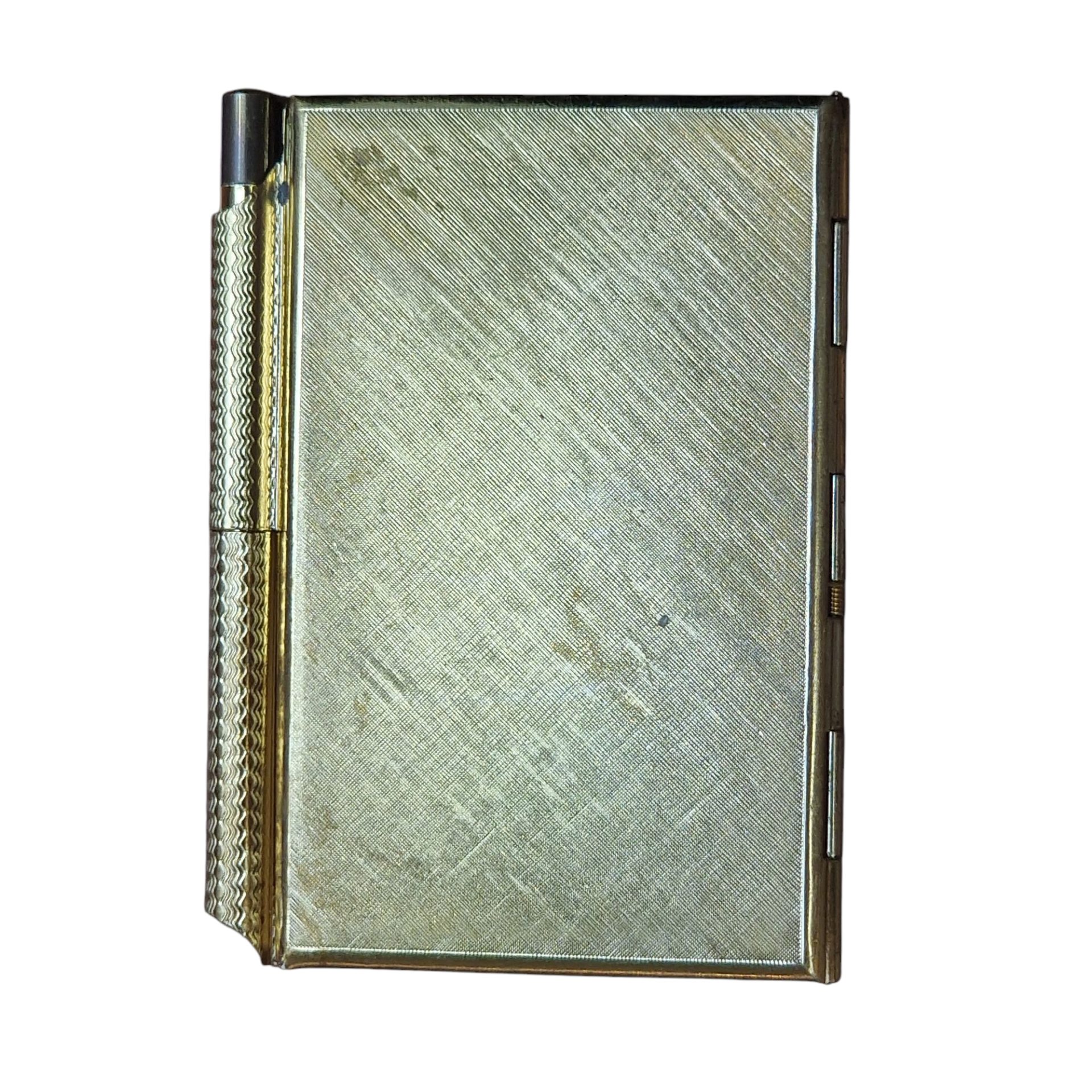 Sobre a peça: Este bloco de notas dourado com caneta é um objeto de papelaria vintage com apelo colecionável. A sua estrutura metálica resistente, aliada ao detalhe decorativo em strass e ao design funcional, tornam-no ideal tanto para uso pontual como para exibição em ambientes com estética retro ou glamourosa. Uma peça utilitária que alia charme nostálgico e refinamento.