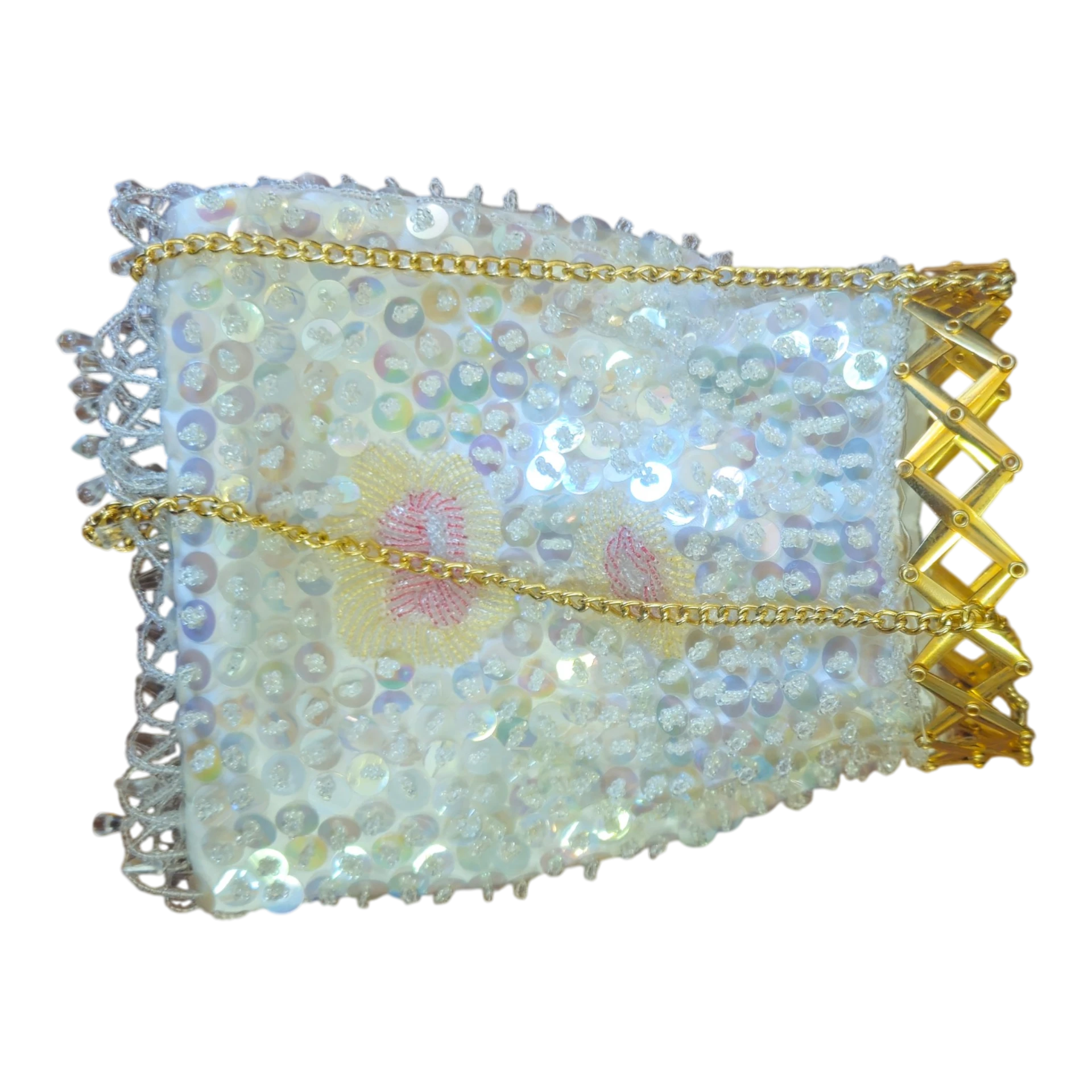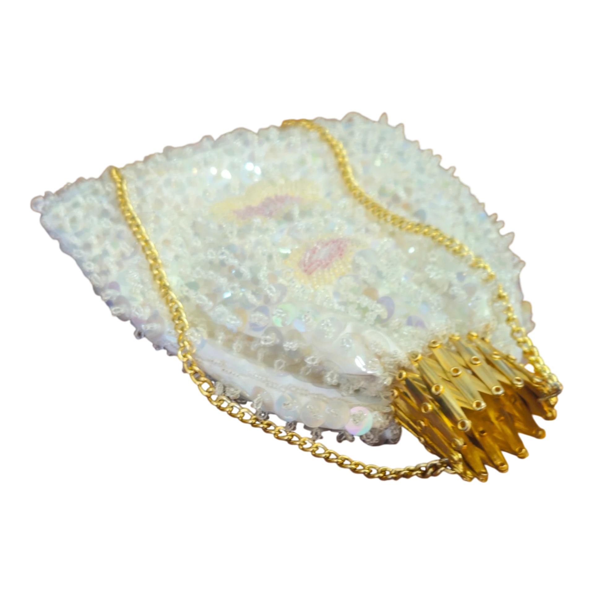Elegante bolsa vintage originária de Macau, decorada com lantejoulas iridescentes e pequenas missangas aplicadas manualmente sobre tecido branco. Este tipo de bolsa era frequentemente vendido como peça artesanal ou souvenir de luxo durante o século XX, quando Macau era ainda território português.