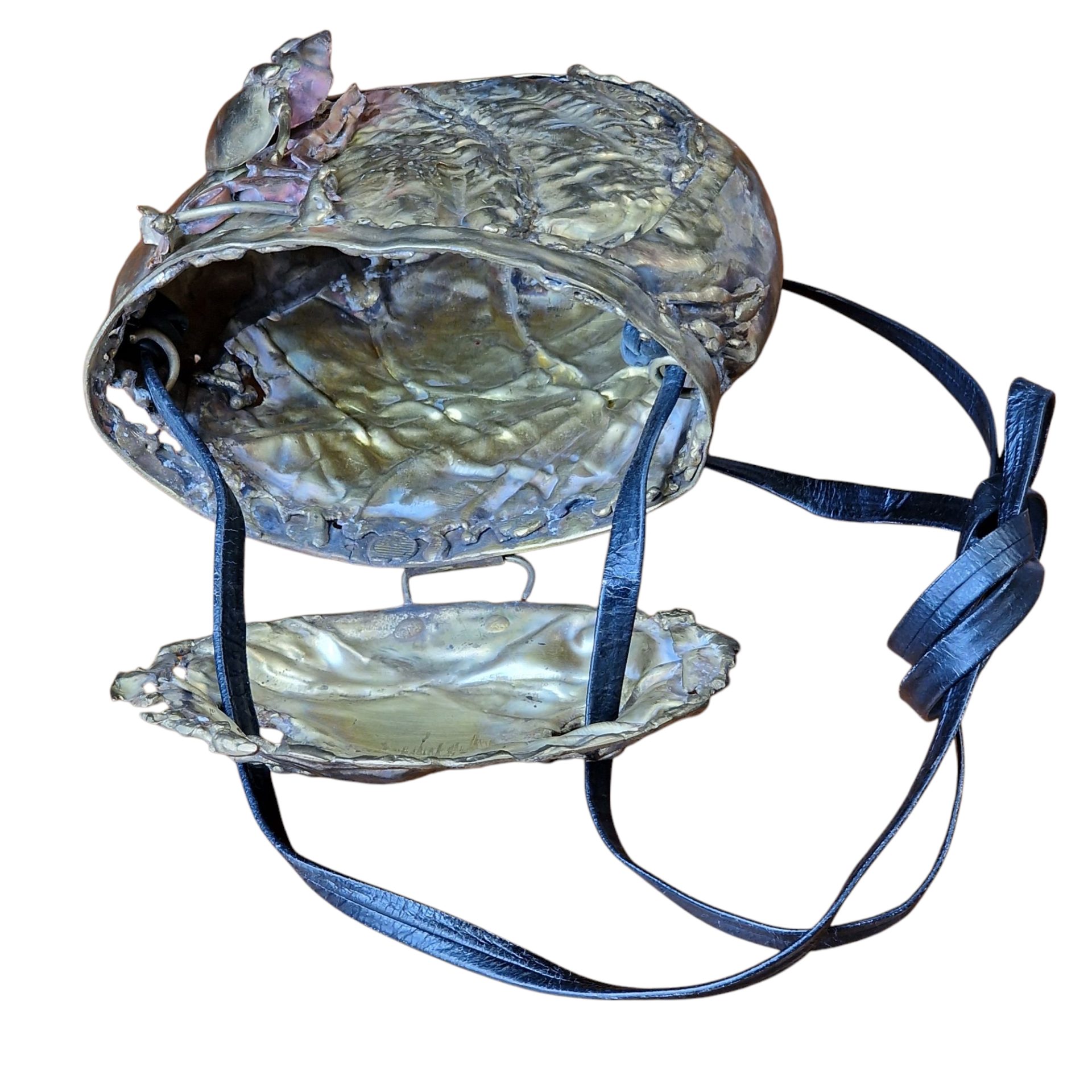 Esta mala escultórica distingue-se pela sua forma irregular e expressiva, sendo inteiramente moldada em latão com superfície texturizada em relevo e soldaduras visíveis que acentuam o seu carácter artesanal. A tampa é articulada e liga-se à base por meio de uma dobradiça de metal, apresentando um fecho metálico simples no interior. A frente exibe elementos escultóricos adicionais, incluindo uma composição em fios e formas curvas soldadas. O interior revela o mesmo tratamento de superfície, com relevos que imitam folhas ou texturas naturais. A alça é feita em couro preto, com acabamento rústico e ligação direta à estrutura metálica através de ilhós reforçados.