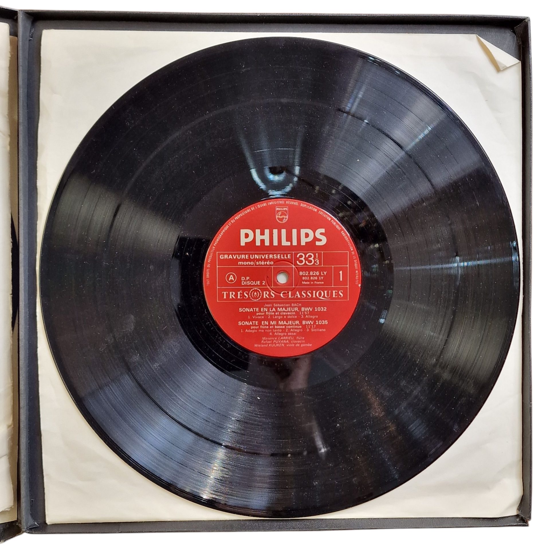 Caixa tripla da Philips com a integral das sonatas para flauta de Johann Sebastian Bach, interpretadas por Maxence Larrieu, Rafael Puyana e Wieland Kuijken, numa edição francesa altamente colecionável.