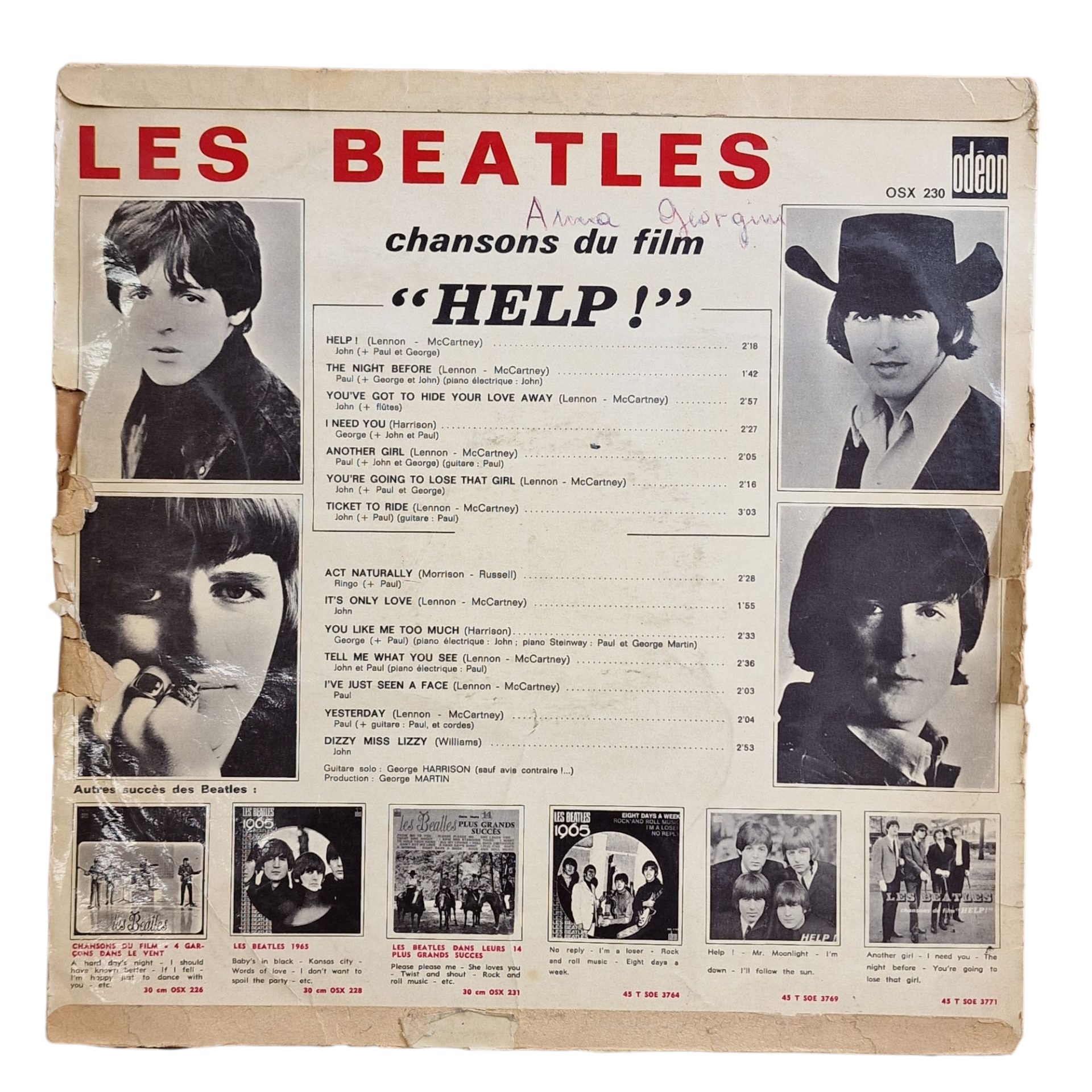 Lançado em 1965 pela Odeon com o número de catálogo OSX 230, Chansons du film “Help!” é a edição francesa do álbum britânico dos Beatles que acompanha o filme Help!, uma comédia musical de aventura protagonizada pelo quarteto de Liverpool. Esta edição contém a banda sonora do filme e outras faixas da mesma época, com título e contracapa adaptados para o mercado francófono. Musicalmente, o álbum marca a transição da banda de um estilo pop mais direto para arranjos mais sofisticados, com a introdução de influências do folk e uma abordagem mais introspectiva, visível em temas como “Yesterday” e “You’ve Got to Hide Your Love Away”. Esta prensagem francesa é muito apreciada por colecionadores pela sua arte gráfica exclusiva e sonoridade distinta das edições britânicas.
