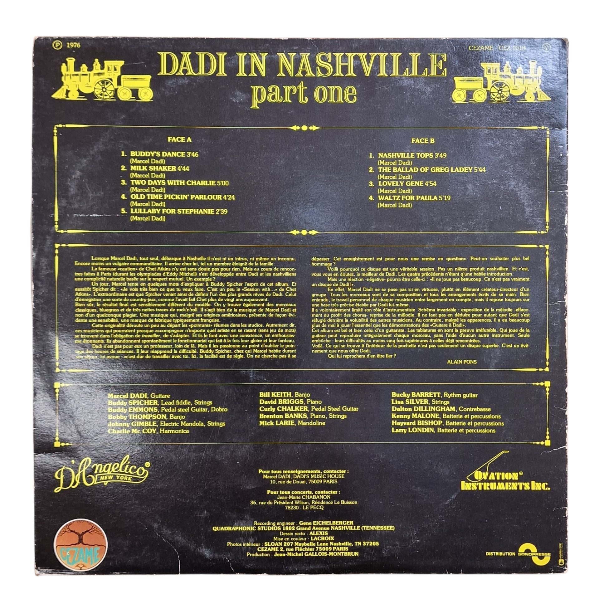 O álbum “Dadi in Nashville – Part One”, também conhecido como “Dadi’s Picking Lights Up Nashville”, é uma obra de 1976 do guitarrista francês Marcel Dadi, editada pela Cézame (referência 1018, França). Gravado nos Quadraphonic Studios em Nashville, Tennessee, o disco conta com a participação de músicos lendários da cena country e bluegrass norte-americana, incluindo Buddy Emmons, Curly Chalker, Bobby Thompson, Bill Keith e Charlie McCoy.