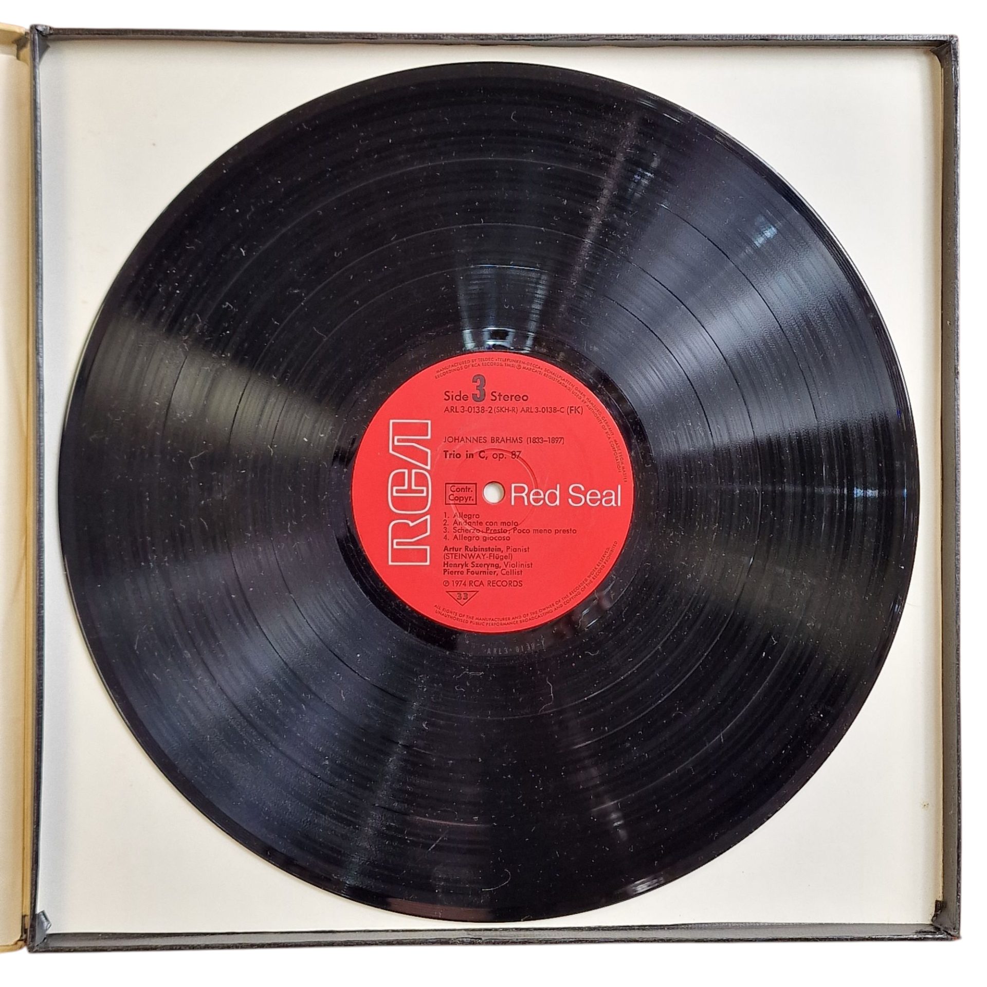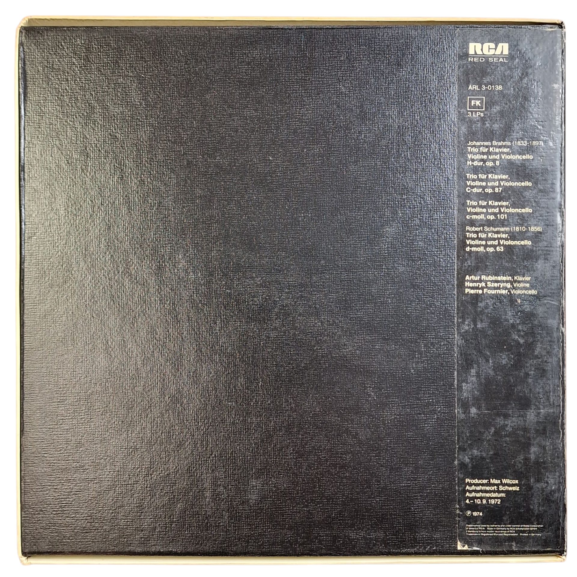 Este conjunto de gravações de 1972, lançado pela RCA em 1974, reúne três das obras-primas do repertório de música de câmara de Johannes Brahms com piano, violino e violoncelo, bem como o celebrado trio em ré menor de Robert Schumann. Com Artur Rubinstein ao piano, Henryk Szeryng no violino e Pierre Fournier no violoncelo, o disco é considerado uma referência absoluta na interpretação deste repertório. As peças foram gravadas na Suíça entre os dias 4 e 10 de setembro de 1972, e a produção ficou a cargo de Max Wilcox. O resultado é uma combinação ímpar de lirismo, virtuosismo e entendimento musical profundo entre os três intérpretes.