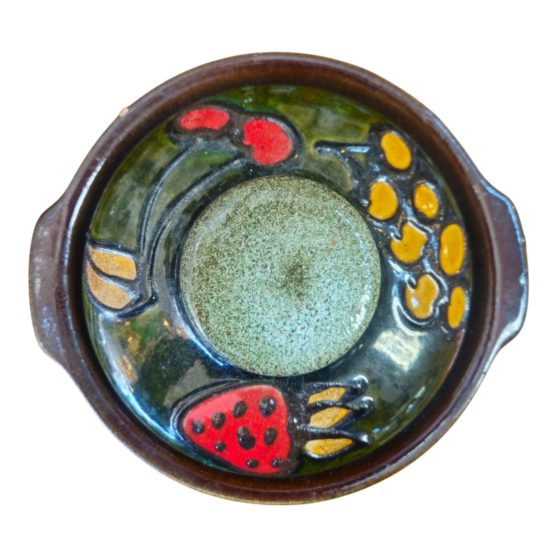 A tampa é decorada com pequenos motivos coloridos estilizados, conferindo à peça um carácter artesanal e distintivo. O formato robusto e as pequenas asas laterais permitem uma manipulação segura, sendo este tipo de panela frequentemente utilizado para cozedura lenta em forno ou fogão tradicional.
