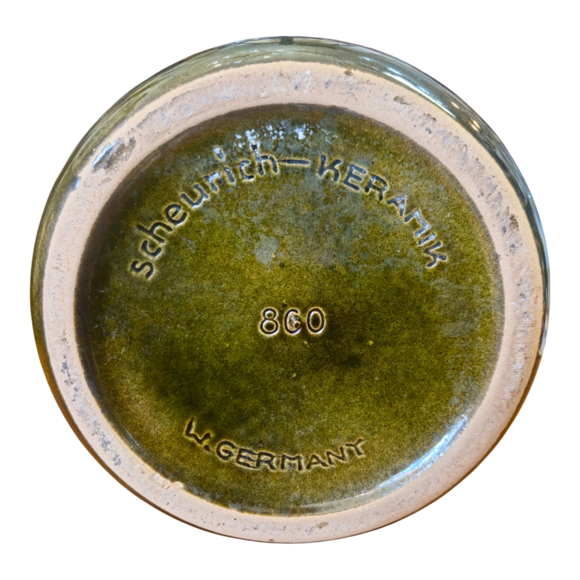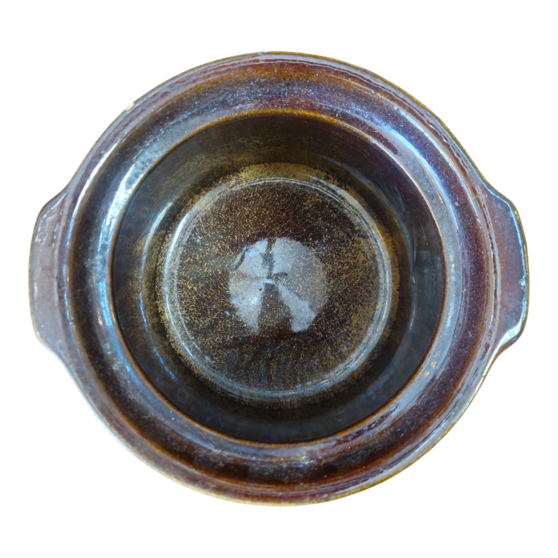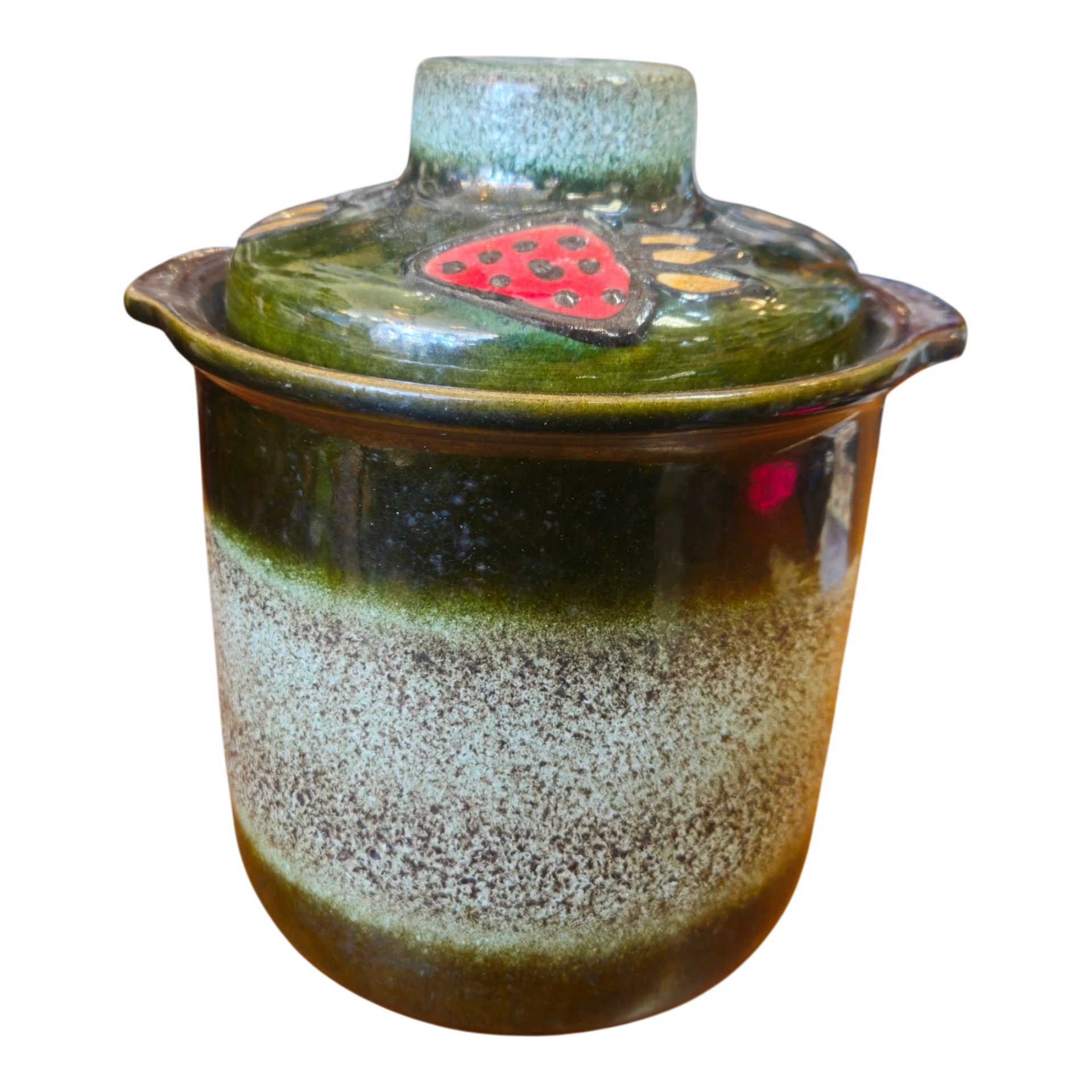 Panela tradicional em cerâmica vidrada, concebida para uso culinário ou decorativo. A peça apresenta um acabamento rústico em tons de verde, castanho e creme, com efeito degradé típico da cerâmica artesanal europeia da segunda metade do século XX.