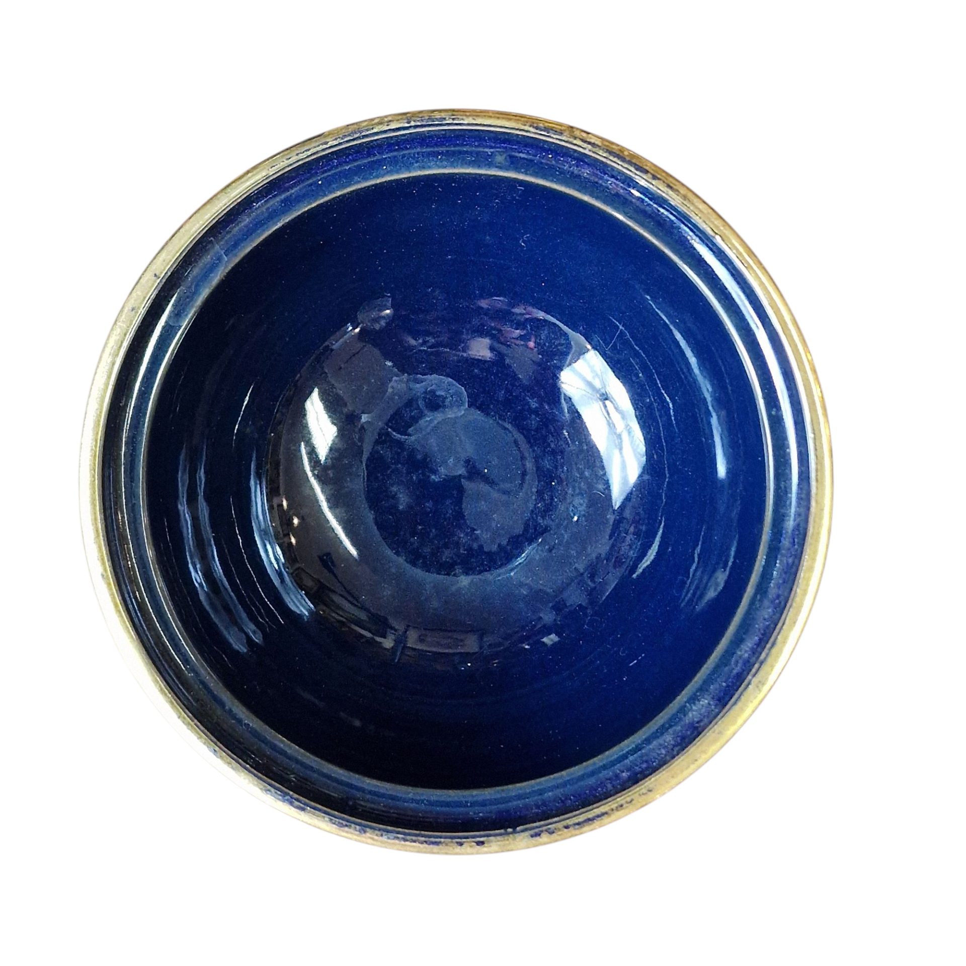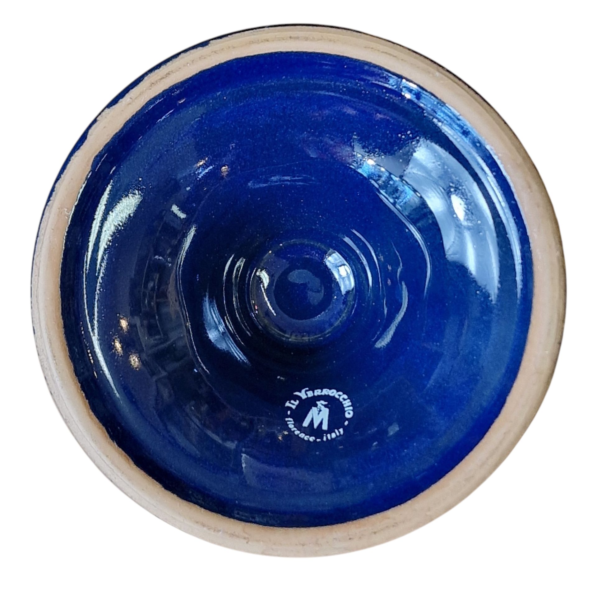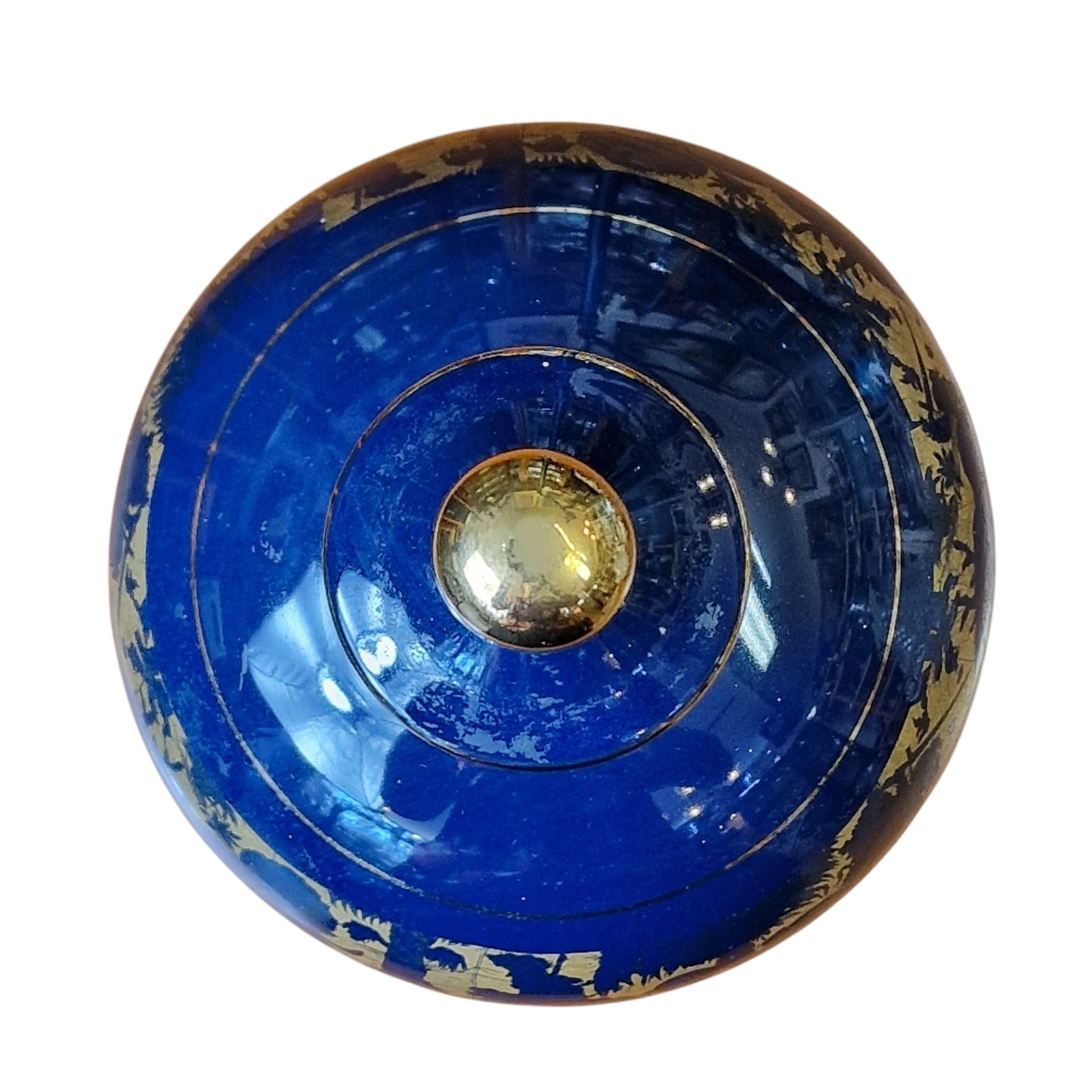 Elegante pote decorativo de fabrico italiano, em cerâmica vidrada com acabamento azul cobalto e detalhada decoração dourada, representando cenas de cavalaria e caça com figuras humanas e animais. A peça apresenta forma esférica e simétrica assente sobre pé alto em cone invertido, com tampa arredondada e pomo dourado. O contraste entre o azul profundo e o dourado confere-lhe requinte e destaque em ambientes clássicos ou ecléticos. Produzido pela casa Il Verrocchio, uma oficina de cerâmica artística localizada em Florença (Firenze), conhecida pela qualidade do seu trabalho manual e riqueza decorativa. A base da peça está marcada com o selo “Il Verrocchio – Firenze – Italy”. Ideal como peça central decorativa ou de coleção.