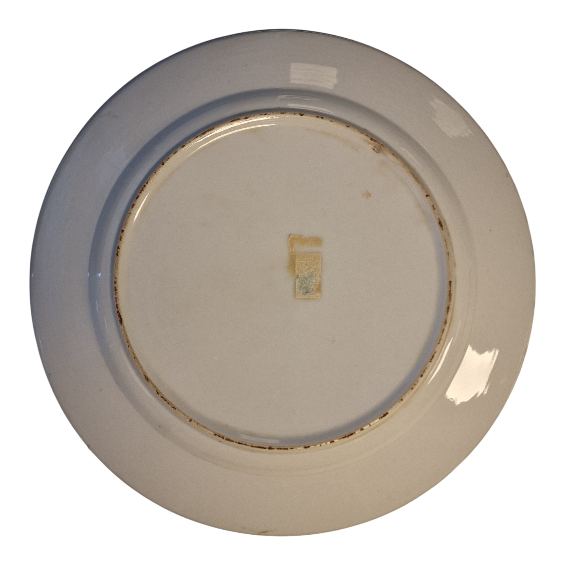 O verso do prato revela apenas o vestígio de uma etiqueta de papel retangular, envelhecida e parcialmente removida, indicando que a peça terá sido comercializada por uma loja portuguesa de decoração ou antiquário, provavelmente entre as décadas de 1950 e 1980. A ausência de marca de fabrico sob o vidrado sugere que se trata de manufatura nacional de porcelana decorativa.