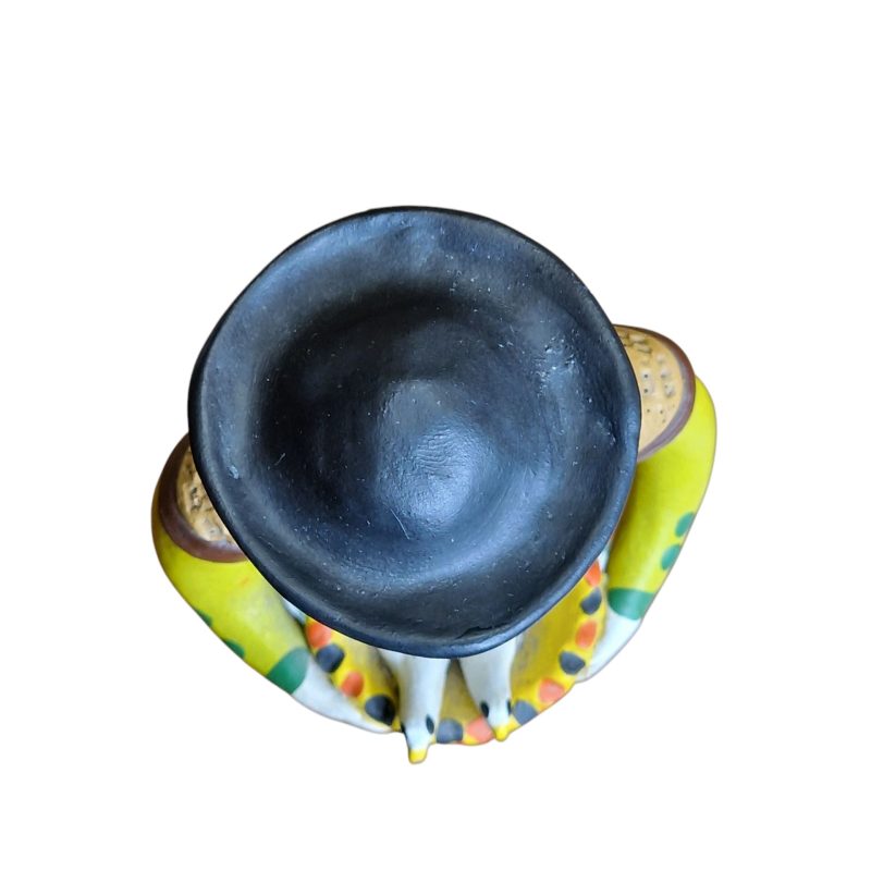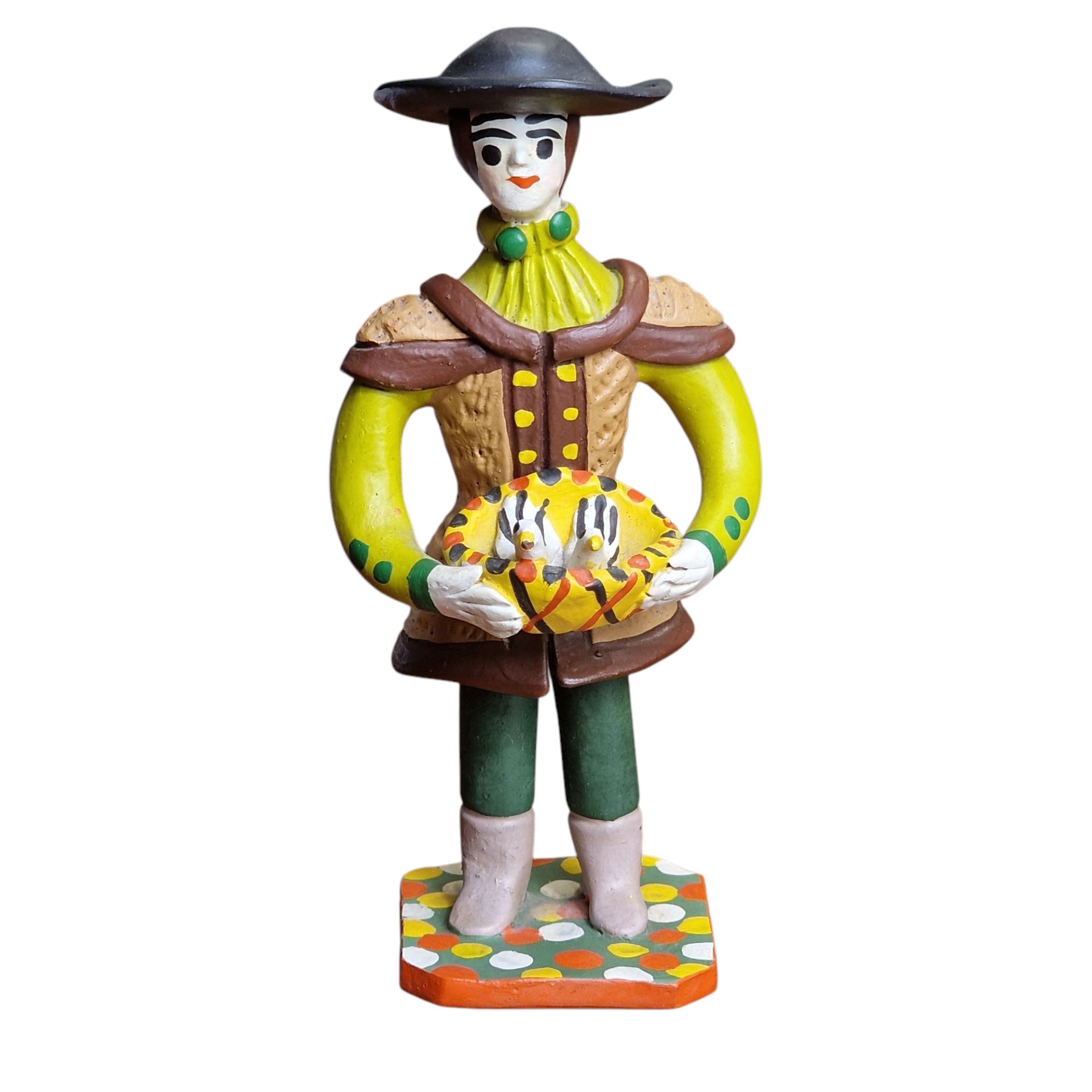 Peça artesanal em barro policromado, representativa da tradição ceramista de Estremoz, classificada como Património Cultural Imaterial da Humanidade pela UNESCO desde 2017. A figura masculina ostenta um traje típico alentejano com cores vivas: chapéu preto de aba larga, camisa amarela com gola franzida e colete castanho texturizado, completado por calças verdes e botas altas. Na base geométrica colorida com círculos multicoloridos, observam-se inscrições feitas à mão, que atestam a autenticidade e origem artesanal da peça. A figura segura um cesto oval decorado com riscas amarelas e vermelhas, onde repousam dois pequenos pássaros pintados com detalhe, simbolizando a ligação à natureza e à vida rural. Trata-se de um exemplar típico da cerâmica figurativa de Estremoz, que valoriza o quotidiano, a fauna e o vestuário tradicional da região do Alentejo.