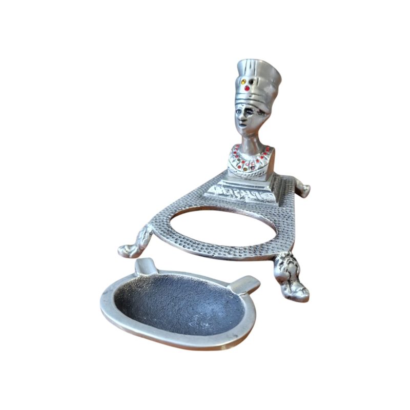 Cinzeiro vintage em metal com um design sofisticado inspirado na arte egípcia, apresentando um busto de Nefertiti com detalhes gravados e pequenos cristais vermelhos decorativos nos olhos e no colar. A base texturizada e os três pés esculpidos conferem-lhe um charme distinto, evocando o estilo Art Déco e a egiptomania do século XX.