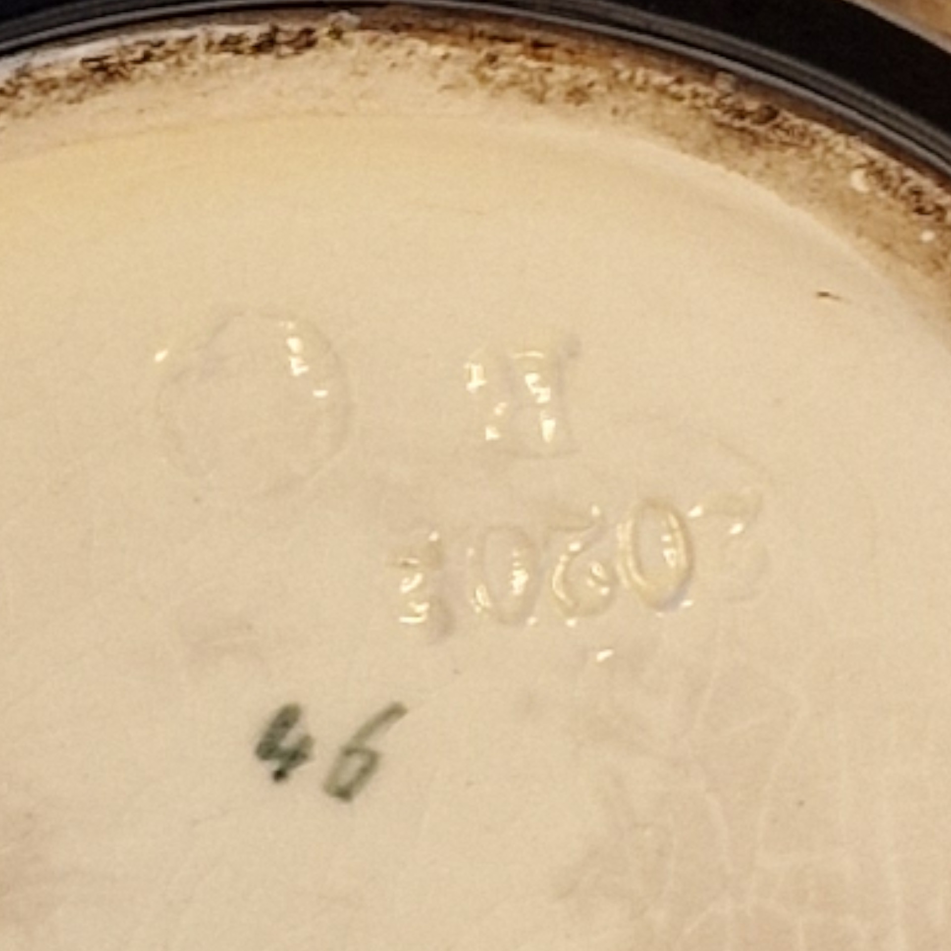Sobre a marca: A peça apresenta marca incisa ilegível, impedindo uma atribuição definitiva. Contudo, as suas características aproximam-na das produções inglesas de Lambeth e Staffordshire, bem como das alemãs de Westerwald e Sarreguemines, conhecidas pelo uso de gres moldado em relevo e vidrados contrastantes com montagens metálicas ornamentais.