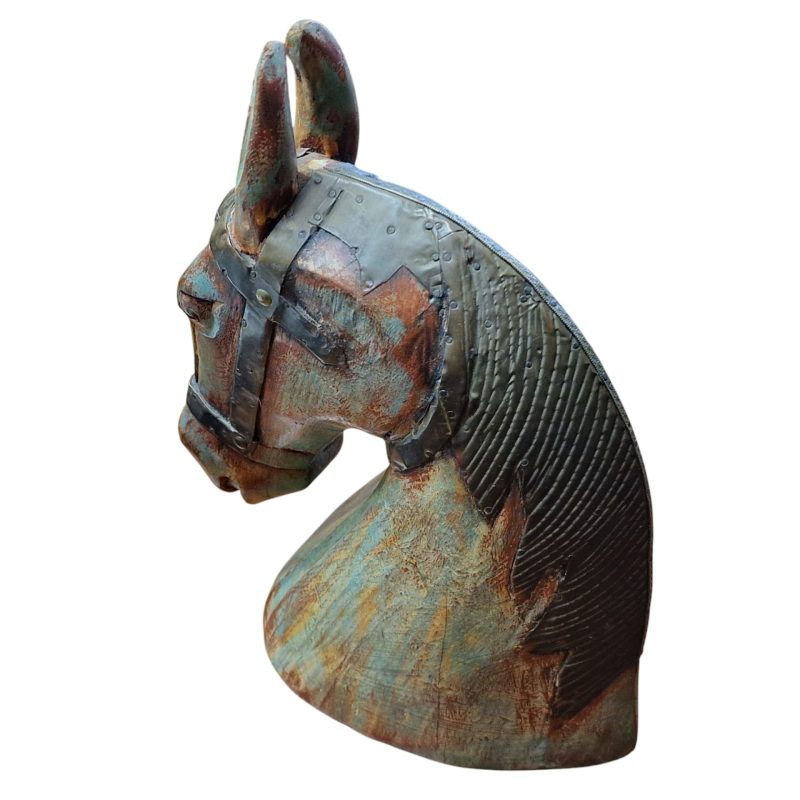 Escultura tridimensional em madeira maciça representando uma cabeça de cavalo, trabalhada com expressividade e acabamento manual. A peça é enriquecida com apliques de latão moldado, simulando arreios e crina, fixados com pequenos rebites, conferindo-lhe uma estética que conjuga o rústico com o decorativo artesanal. A superfície apresenta pátina artificial em tons esverdeados e ferrugem, sugerindo antiguidade e conferindo-lhe forte presença visual.