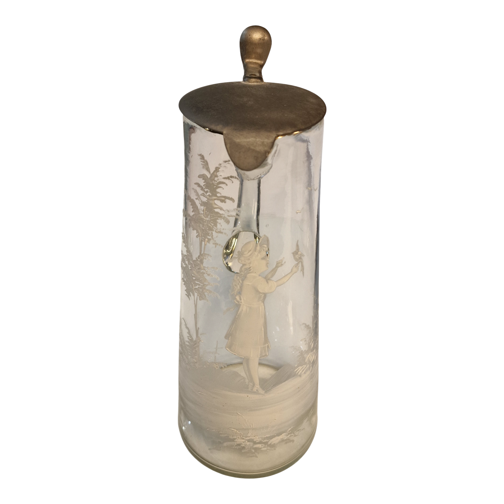 Esta requintada jarra antiga é um exemplar de grande valor decorativo e histórico. Produzida em vidro transparente, apresenta decoração pintada à mão a esmalte branco, representando uma jovem em ambiente campestre, rodeada por árvores e vegetação. A pintura é delicada, realçando o detalhe artístico típico das oficinas boémias e alemãs do final do século XIX e início do século XX.