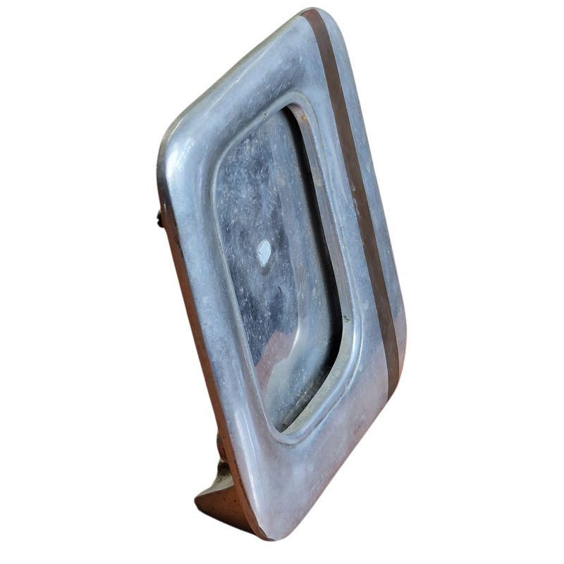 Elegante moldura retangular em metal prateado com acabamento polido, destacando-se pela aplicação de uma faixa vertical em cobre numa das extremidades, conferindo-lhe um toque de sofisticação minimalista. Esta peça apresenta uma estética industrial refinada, com linhas curvas suaves e cantos arredondados, típica do design funcionalista de meados do século XX. O verso revela a marca Ornato, reconhecida pelo fabrico de peças decorativas em metal de alta qualidade. A moldura está preparada para receber uma fotografia vertical e pode ser utilizada como elemento decorativo em ambientes contemporâneos, modernos ou industriais.