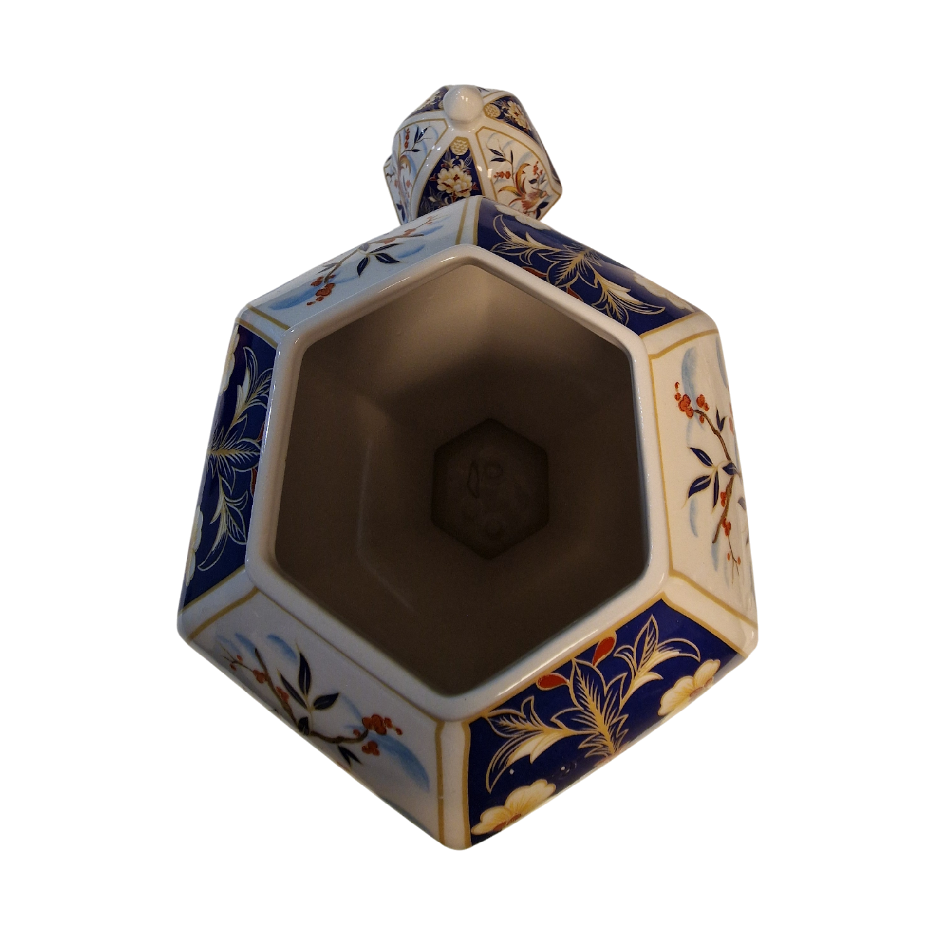 Pote decorativo em porcelana da marca PANDA, com formato hexagonal e tampa, medindo aproximadamente 35,5 cm de altura. Peça em excelente estado, sem lascas ou defeitos, com pintura detalhada em tons azuis, vermelhos e dourados, representando motivos orientais e florais.